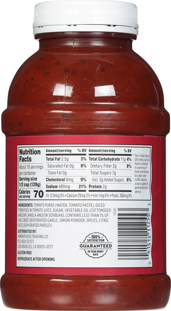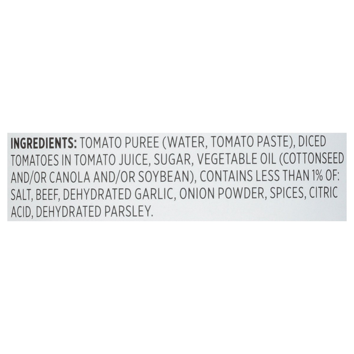 Tomato Puree (Water, Tomato Paste), Diced Tomatoes in Tomato Juice, Sugar, Vegetable Oil (Cottonseed and/or Canola and/or Soybean), Contains Less than 1% of: Salt, Beef, Dehydrated Garlic, Onion Powde…