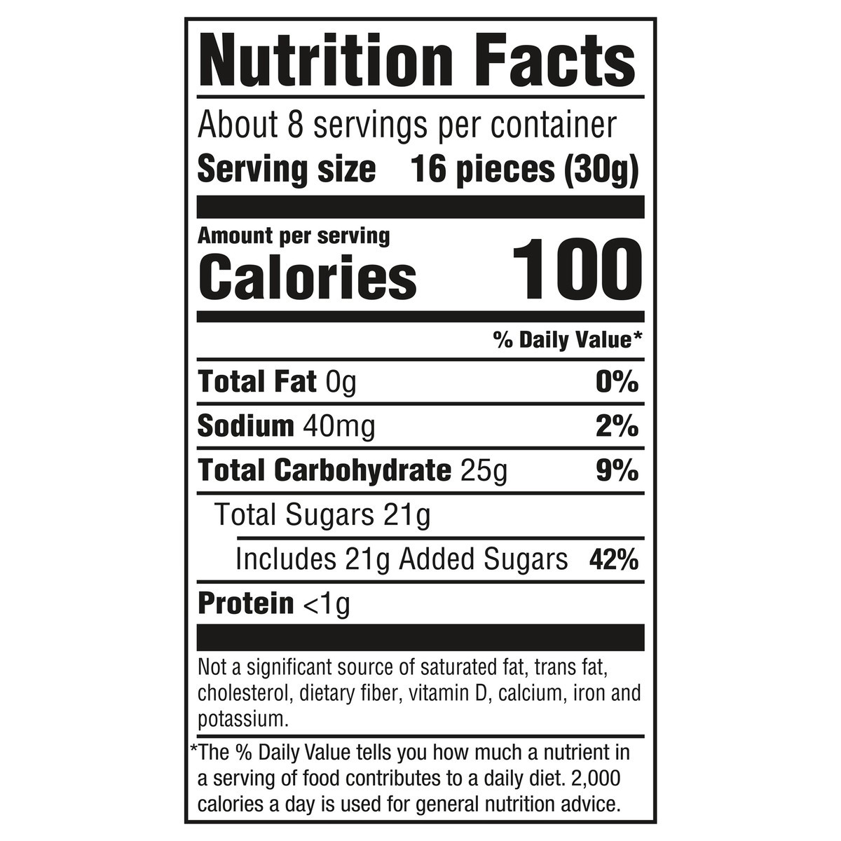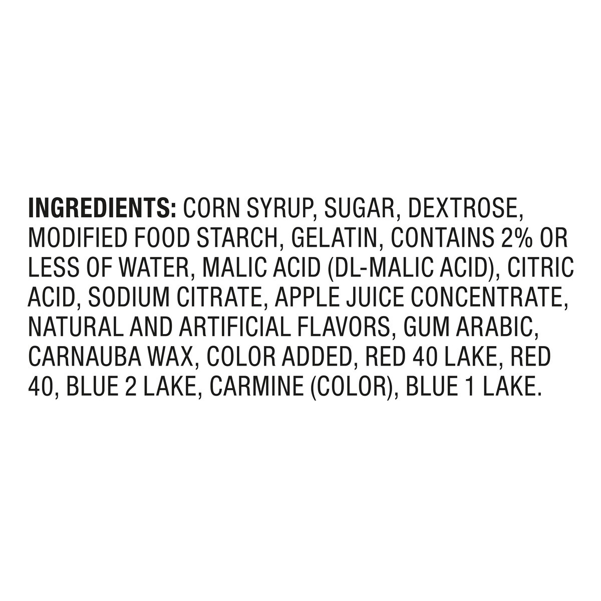 Corn Syrup, Sugar, Dextrose, Modified Food Starch, Gelatin, Contains 2% or Less of Water, Malic Acid (DL-Malic Acid), Citric Acid, Sodium Citrate, Apple Juice Concentrate, Natural and Artificial Flavo…