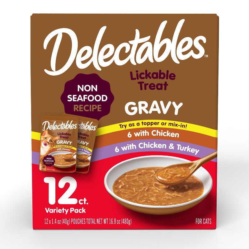 Delectables Gravy Lickable Treat has a unique wet texture that combines tender real chicken and turkey with a thick & hearty gravy without any seafood, even the most finicky cats will be begging for m…
