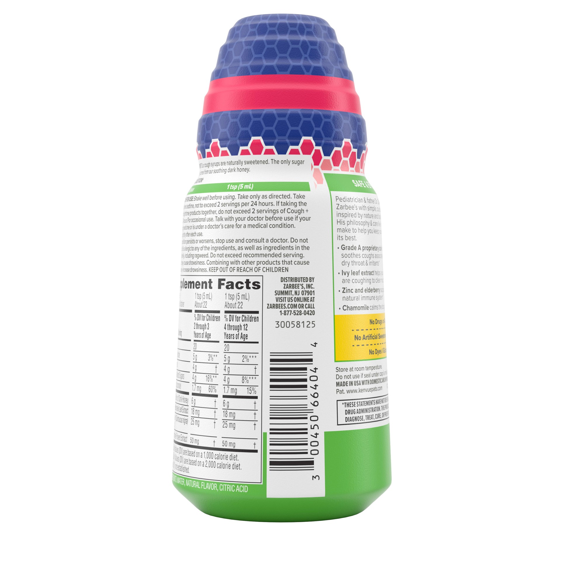Serving Size: 1 tsp (5 mL) Zinc (as zinc gluconate) 1.7 mg, Proprietary Blend of Dark Honey 6 g, English Ivy (Hedera helix) Leaf Extract 18 mg, Black Elderberry (Sambucus nigra) Fruit Extract 25 mg Ge…
