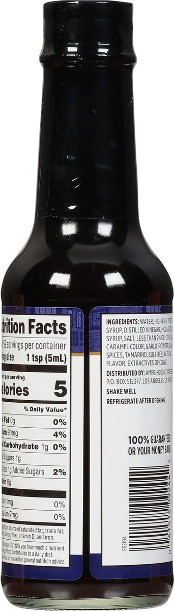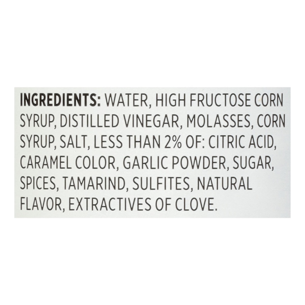 Water, High Fructose Corn Syrup, Distilled Vinegar, Molasses, Corn Syrup, Salt, Less than 2% of: Citric Acid, Caramel Color, Garlic Powder, Sugar, Spices, Tamarind, Sulfites, Natural Flavor, Extractiv…