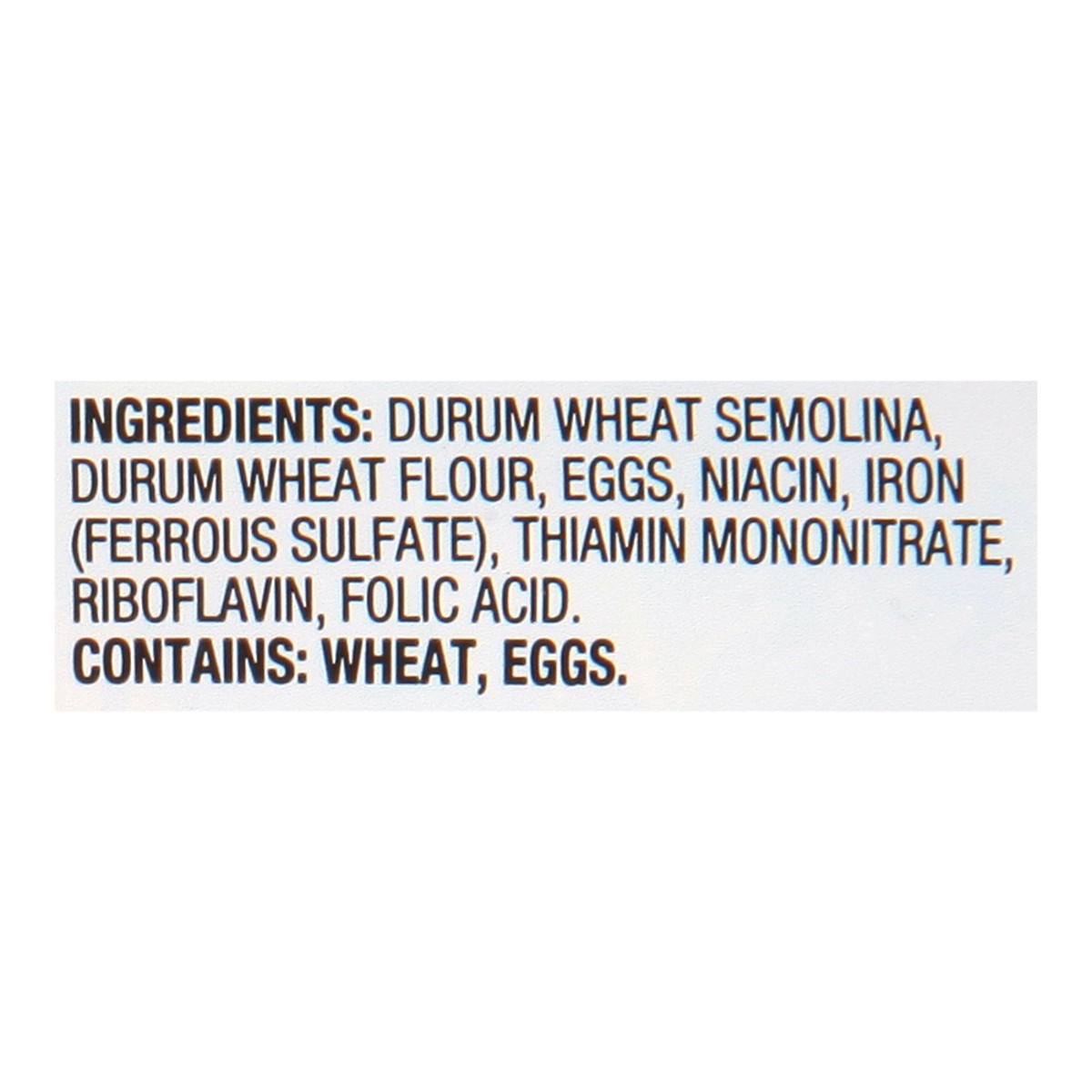 Durum Wheat Semolina, Durum Wheat Flour, Eggs, Niacin, Iron (Ferrous Sulfate), Thiamin Mononitrate, Riboflavin, Folic Acid.