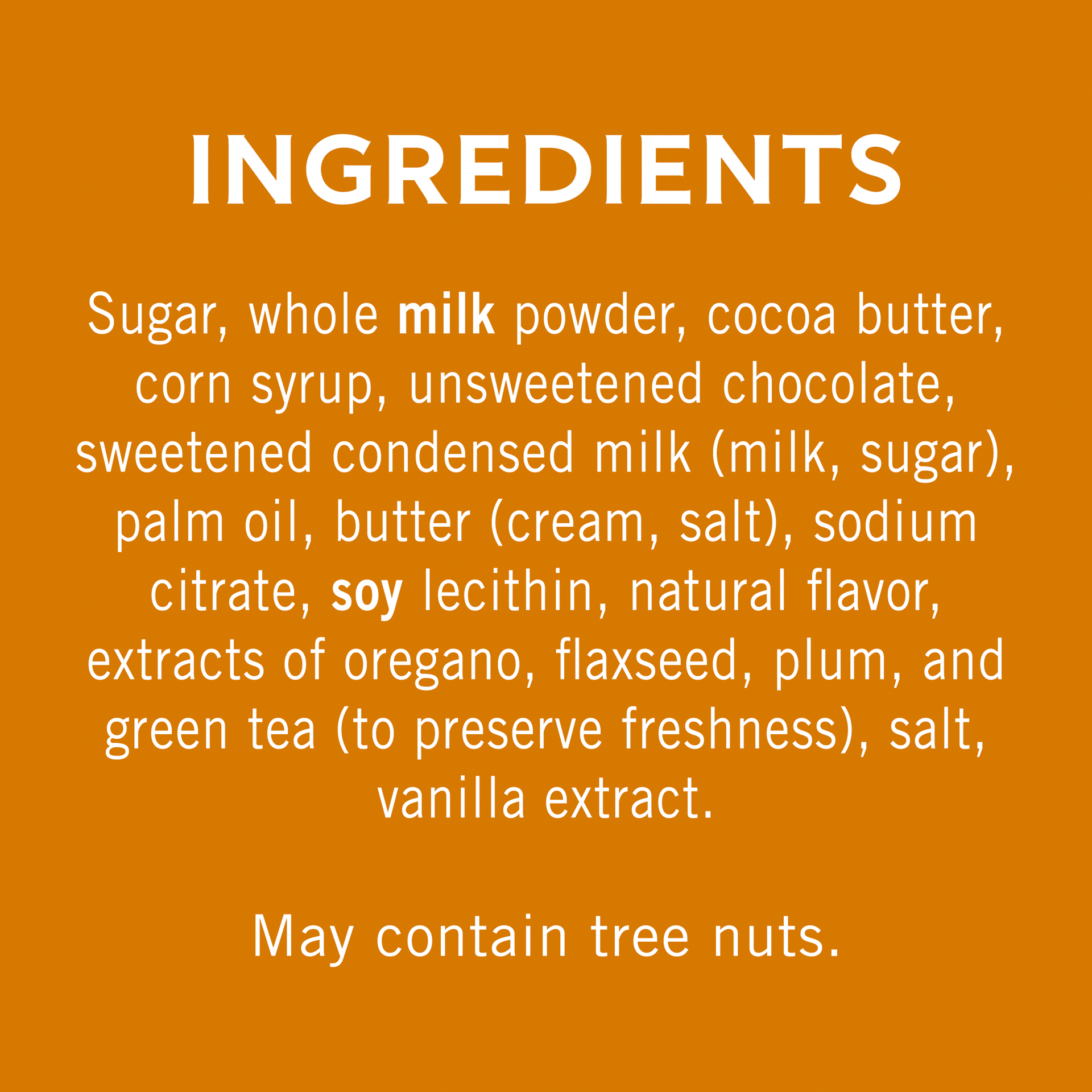 Ingredients: Sugar, whole milk powder, cocoa butter, corn syrup, unsweetened chocolate, sweetened condensed milk (milk, sugar), palm oil, butter (cream, salt), sodium citrate, soy lecithin, natural fl…