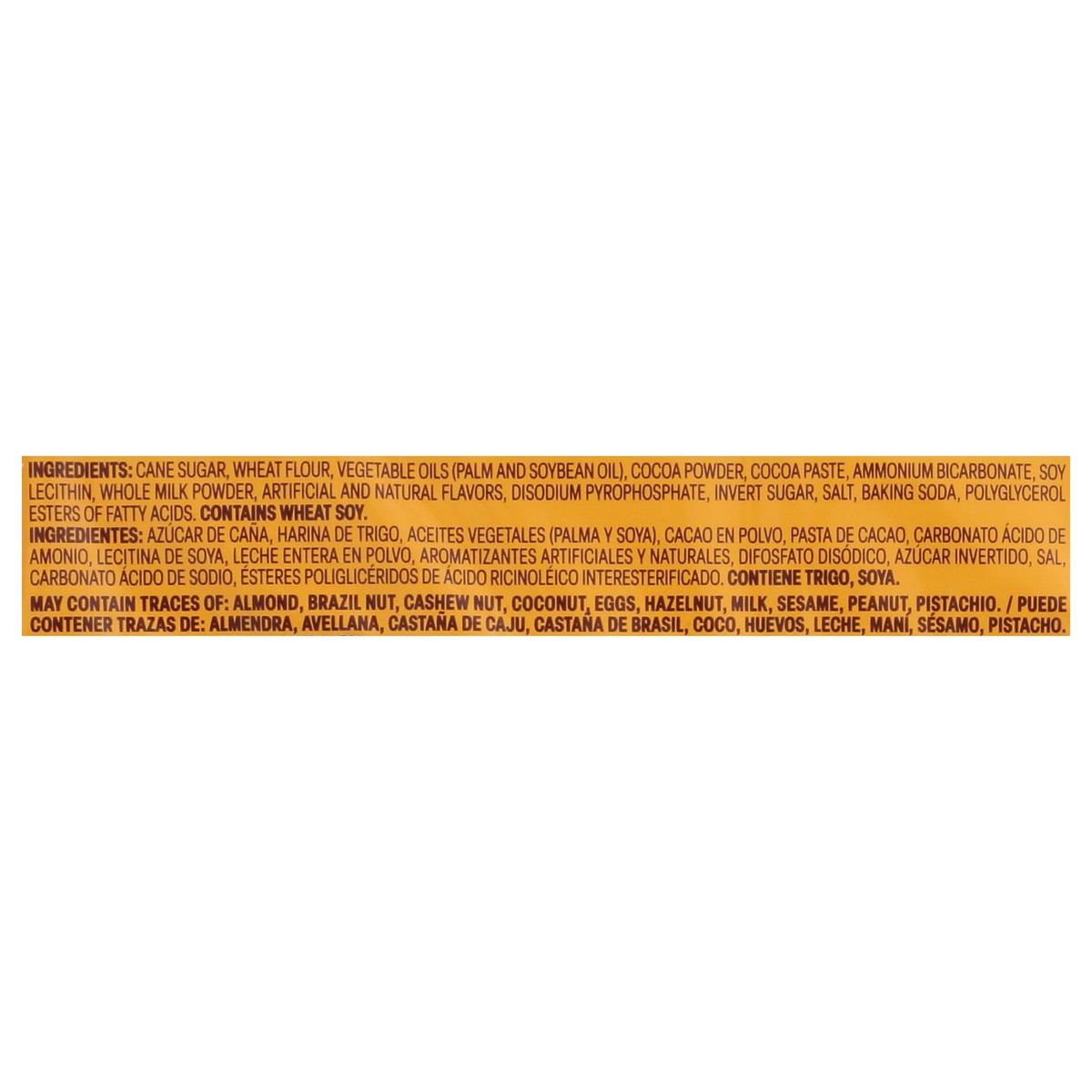 Cane Sugar, Wheat Flour, Vegetable Oils (Palm and Soybean Oil), Cocoa Powder, Cocoa Paste, Ammonium Bicarbonate, Soy Lecithin, Whole Milk Powder, Artificial and Natural Flavors, Disodium Pyrophosphate…