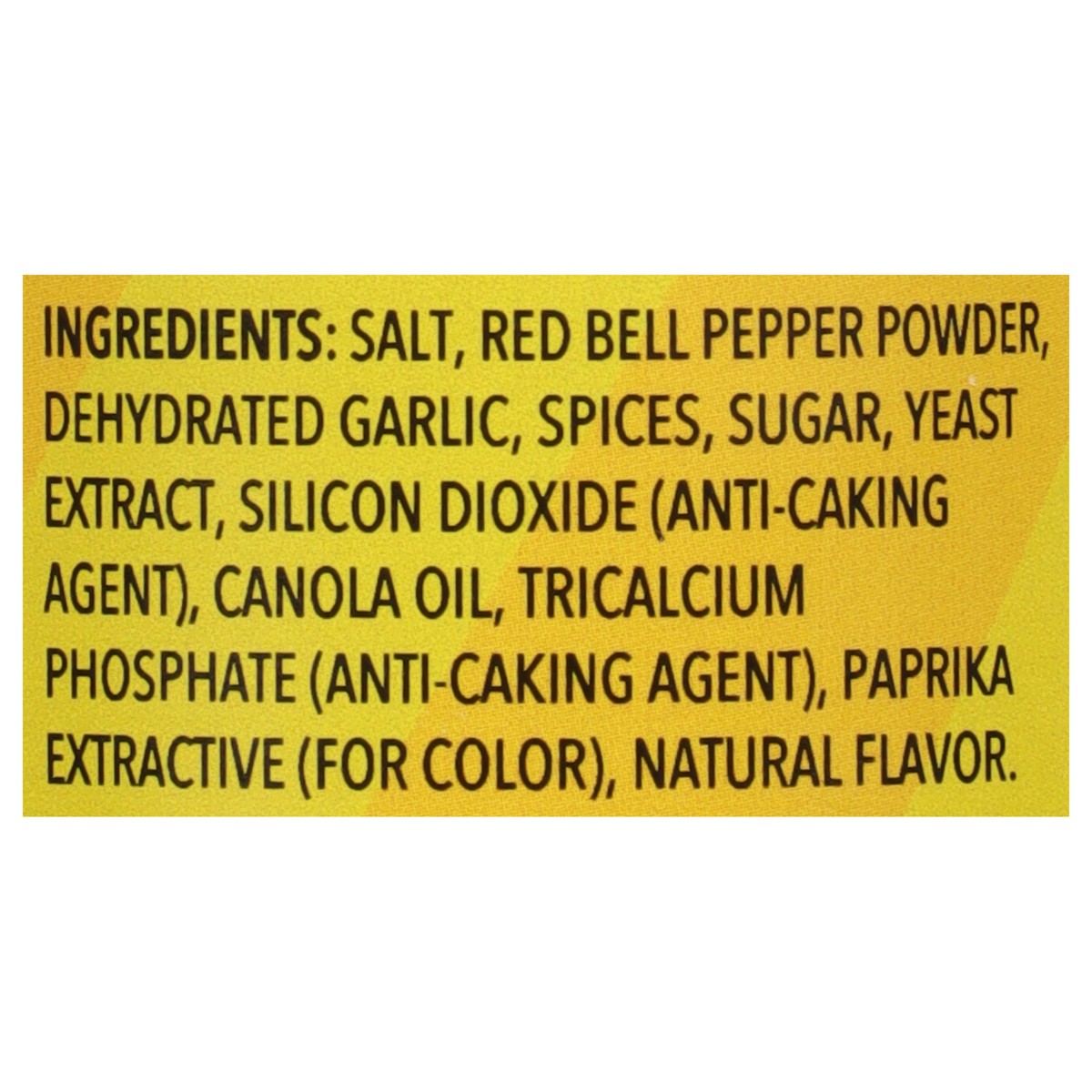 Salt, Red Bell Pepper Powder, Dehydrated Garlic, Spices, Sugar, Yeast Extract, Silicon Dioxide (Anti-Caking Agent), Canola Oil, Tricalcium Phosphate (Anti-Caking Agent), Paprika Extractive (for Color)…