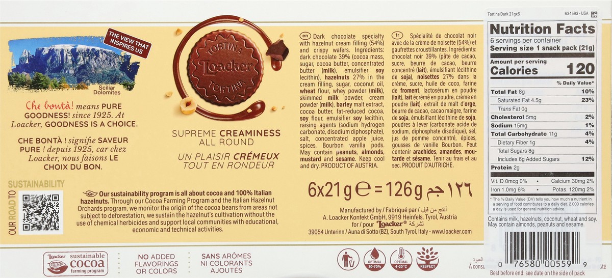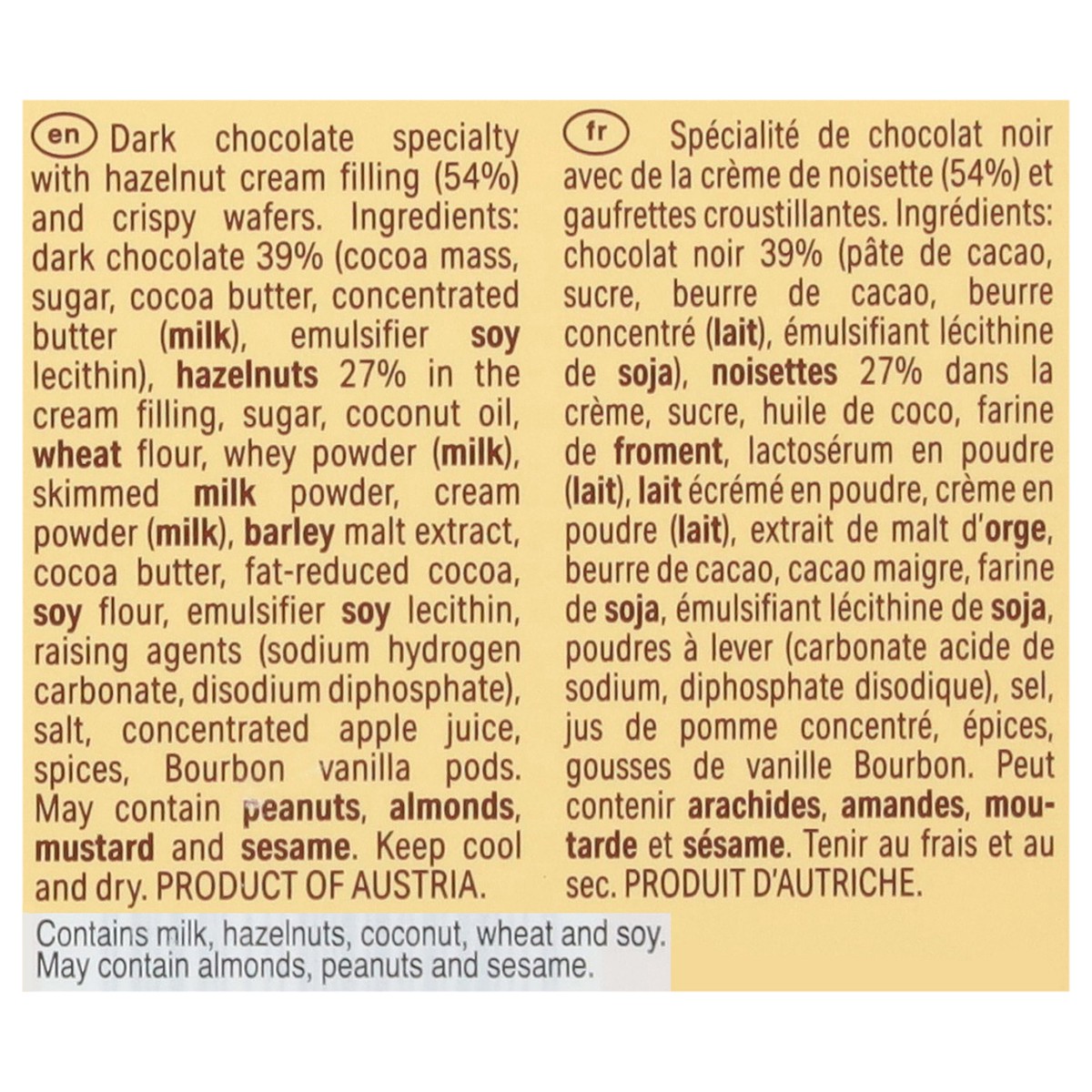 Dark Chocolate 39% (Cocoa Mass, Sugar, Cocoa Butter, Concentrated Butter (Milk), Emulsifier Soy Lecithin), Hazelnuts 27% in the Cream Filling, Sugar, Coconut Oil, Wheat Flour, Whey Powder (Milk), Skim…