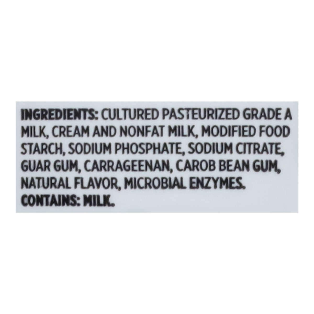 Cultured Pasteurized Grade A Milk, Cream and Nonfat Milk, Modified Food Starch, Sodium Phosphate, Sodium Citrate, Guar Gum, Carrageenan, Carob Bean Gum, Natural Flavor, Microbial Enzymes.