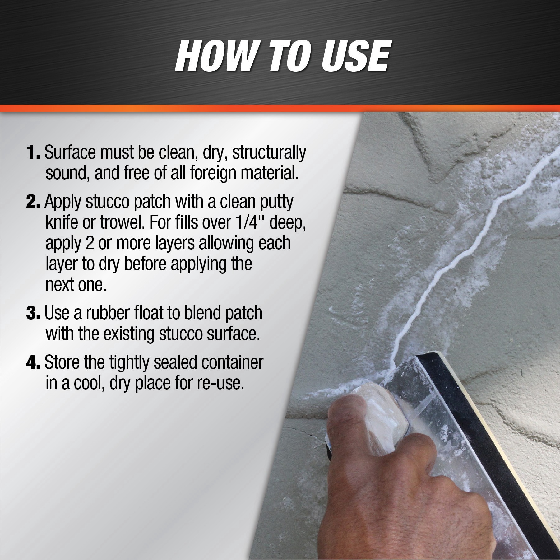 All purpose stucco patch is ideal for filling and concealing small holes, cracks, dents, and defects to a smooth finish. Stucco patch in a ready to use formula makes fast and easy repairs, ideal for q…