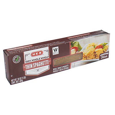 Made from 100% whole wheat, these H-E-B thin spaghetti noodles offer a good source of fiber. Boil them in a big pot on the stovetop the next time everyone's craving spaghetti and meatballs and top wit…