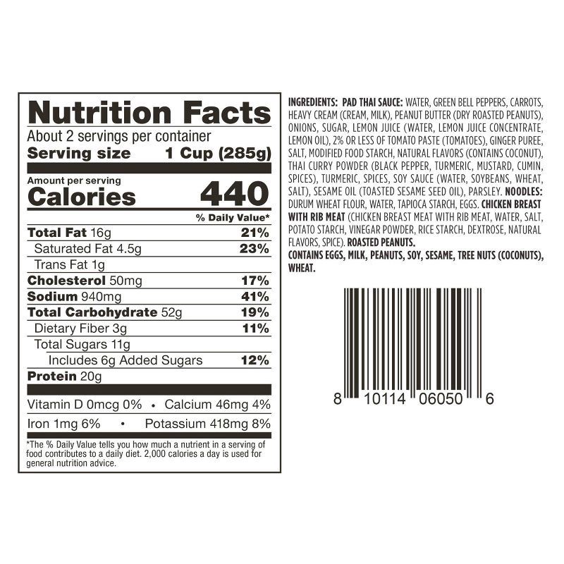Chicken Pad Thai Sauce: Water, Seasoned Chicken Breast Meat Strips with Rib Meat (Chicken Breast Meat with Rib Meat, Water, Salt, Potato Starch, Vinegar Powder, Rice Starch, Dextrose, Natural Flavors,…