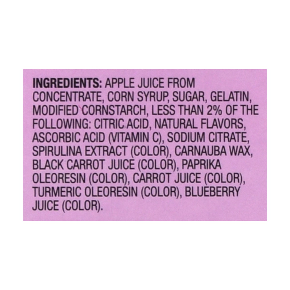 Apple Juice from Concentrate, Corn Syrup, Sugar, Gelatin, Modified Cornstarch, Less than 2% of the Following Citric Acid, Natural Flavors, Ascorbic Acid (Vitamin C), Sodium Citrate, Spirulina Extract …