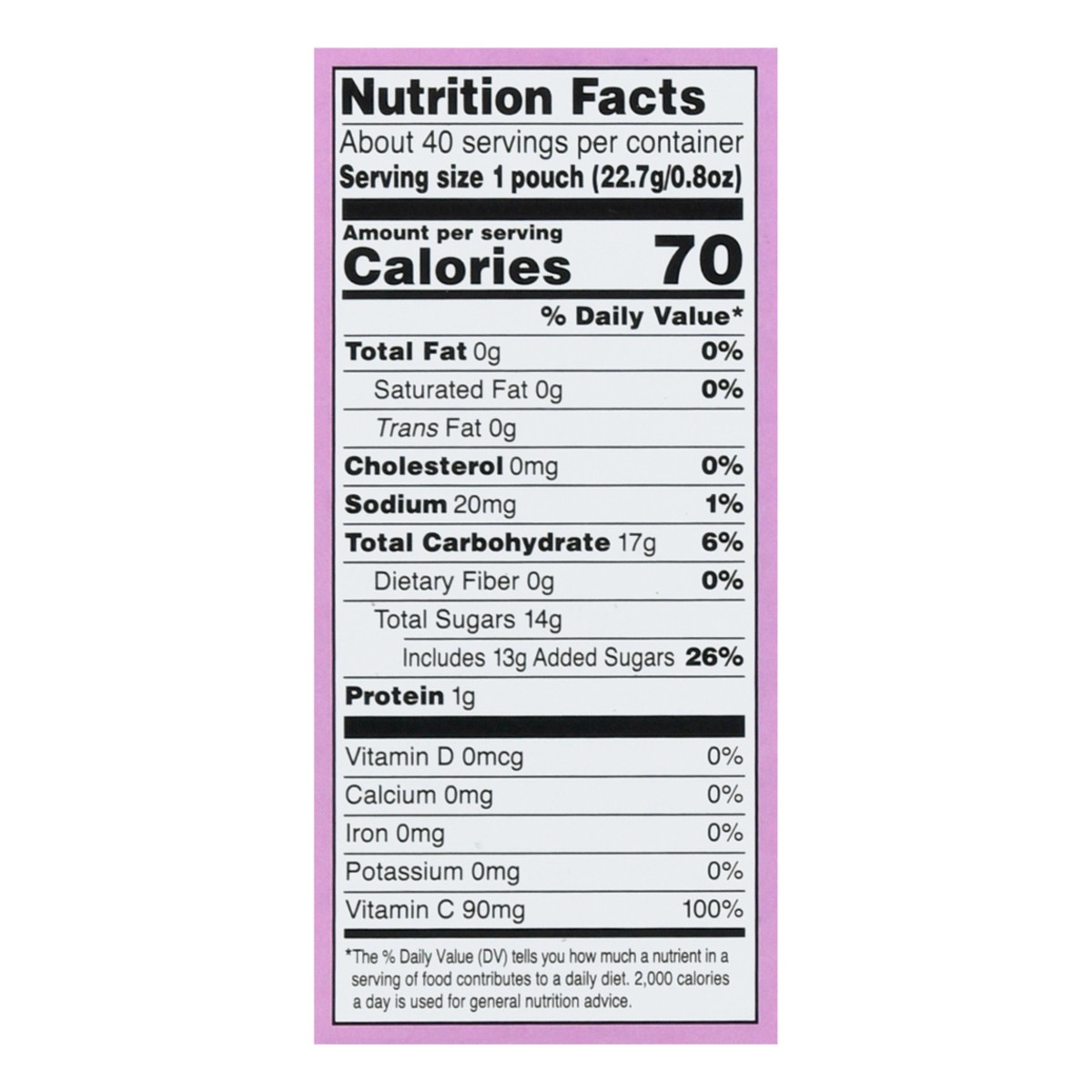 No synthetic colors or flavors. Per 1 Pouch: 70 calories; 0 g sat fat (0% DV); 20 mg sodium (1% DV); 14 g total sugars. Contains A Bioengineered food ingredients. 100% satisfaction guarantee our quali…