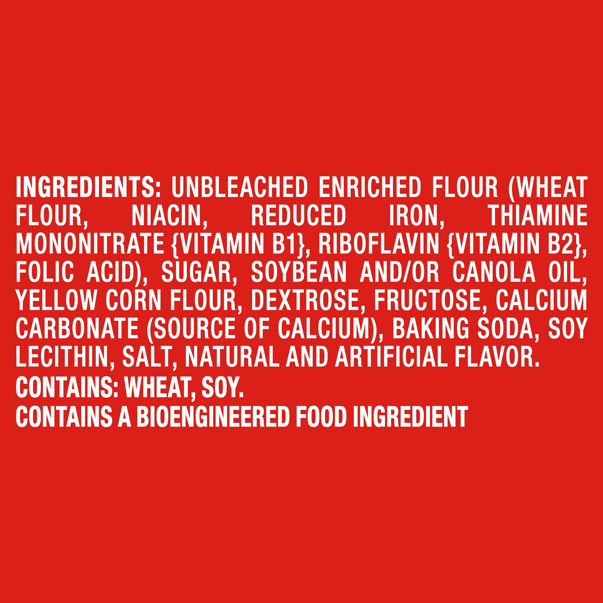 Unbleached Enriched Flour (Wheat Flour, Niacin, Reduced Iron, Thiamine Mononitrate {Vitamin B1}, Riboflavin {Vitamin B2}, Folic Acid), Sugar, Soybean and/or Canola Oil, Yellow Corn Flour, Dextrose, Fr…