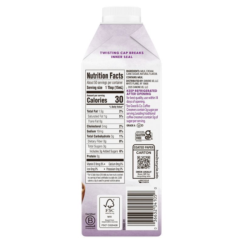 Too Good & Co. Sweet Cream Coffee Creamer is made with farm-fresh cream, real milk and real cane sugar with natural flavor. This creamer contains 40% less sugar than leading coffee creamers* and no ar…