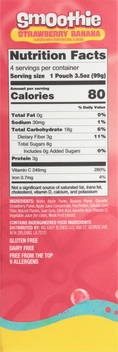 Water, Apple Puree, Banana Puree, Glycerin, Strawberry Puree, Apple Juice Concentrate, Pea Protein, Soluble Corn Fiber, Natural Flavors, Guar Gum, Citric Acid, Ascorbic Acid (Vitamin C), Vegetable Juiā¦