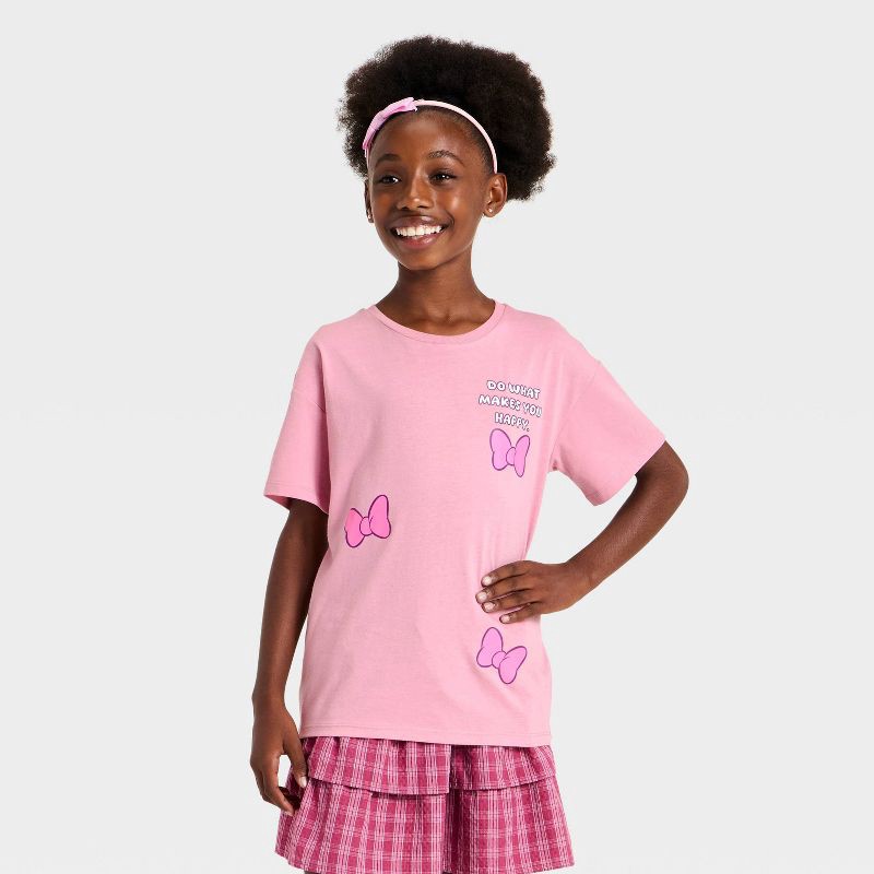 Add playful Disney charm to her wardrobe with this Girls' Minnie Mouse Oversized Front and Back Graphic Short Sleeve T-Shirt in pink. Made from soft, breathable cotton-blend fabric, it keeps her cool …