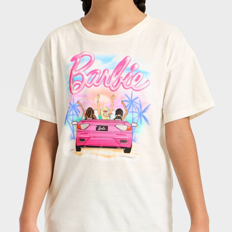 - Airbrush-style Barbie graphic adds bold, trendy flair
