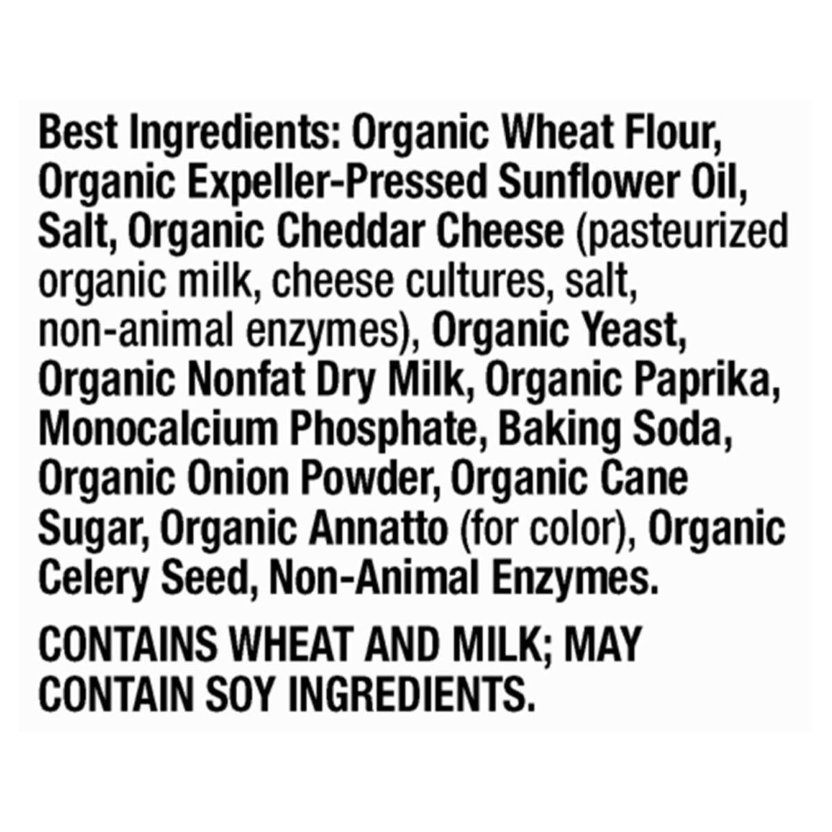 Organic Wheat Flour, Organic Expeller-Pressed Sunflower Oil, Sea Salt, Organic Cheddar Cheese (Pasteurized Organic Milk, Cheese Cultures, Salt, Non-Animal Enzymes), Organic Nonfat Dry Milk, Organic Pa…