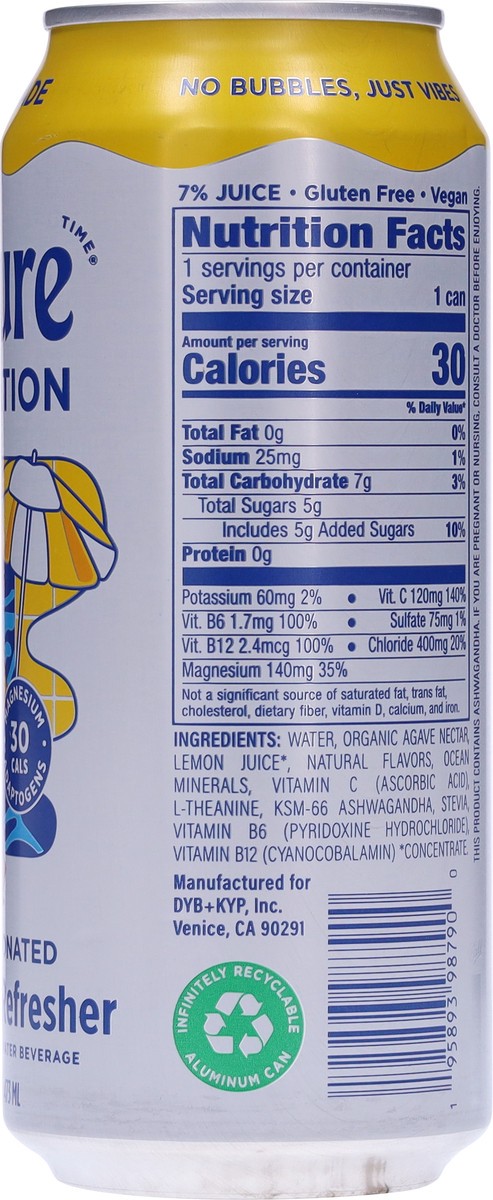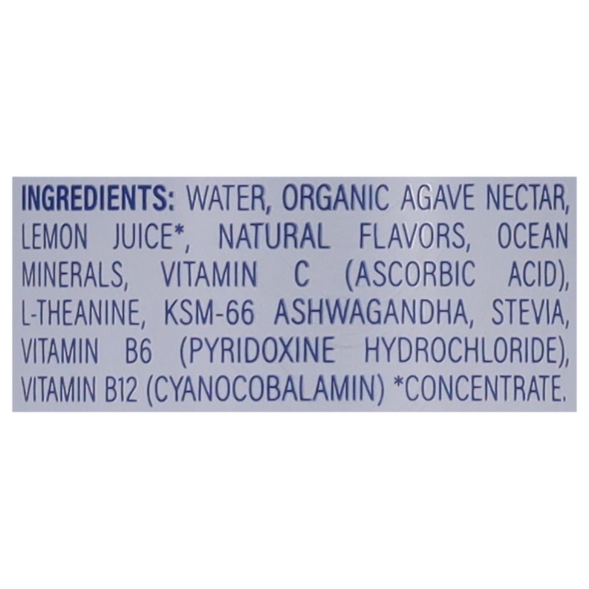 Water, Organic Agave Nectar, Lemon Juice (Concentrate), Natural Flavors, Ocean Minerals, Vitamin C (Ascorbic Acid), L-Theanine, Ashwagandha, Stevia, VitaMin B6 (Pyridoxine Hydrochloride), Vitamin B12 …