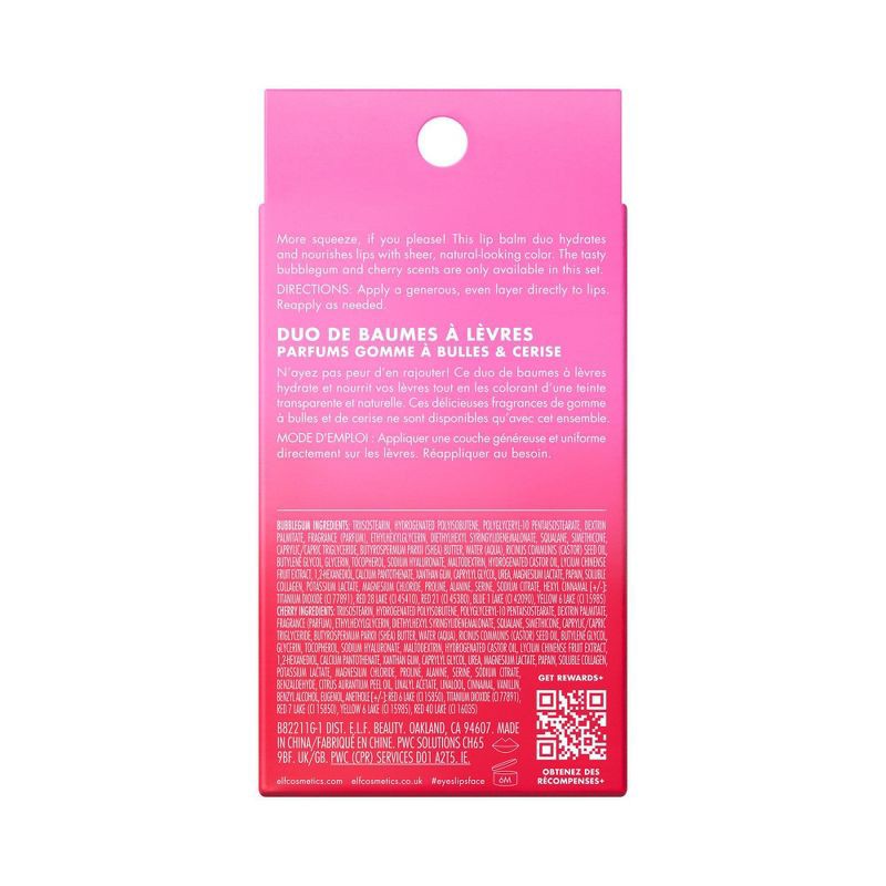 - Set of 2 Squeeze Me Lip Balms in exclusive scents and shades that e.l.f. fans picked — Cherry and Bubblegum