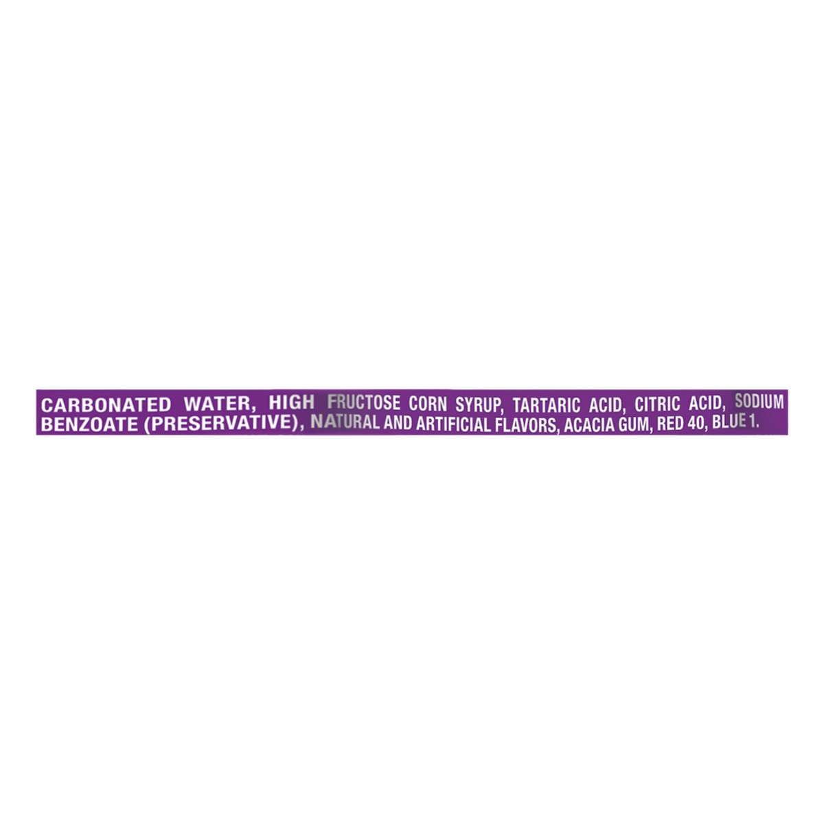 Carbonated Water, High Fructose Corn Syrup, Tartaric Acid, Citric Acid, Sodium Benzoate (Preservative), Natural and Artificial Flavors, Acacia Gum, Red 40, Blue 1.