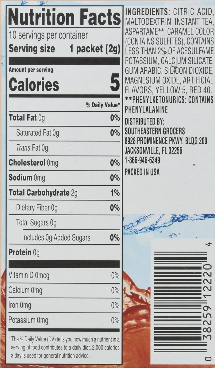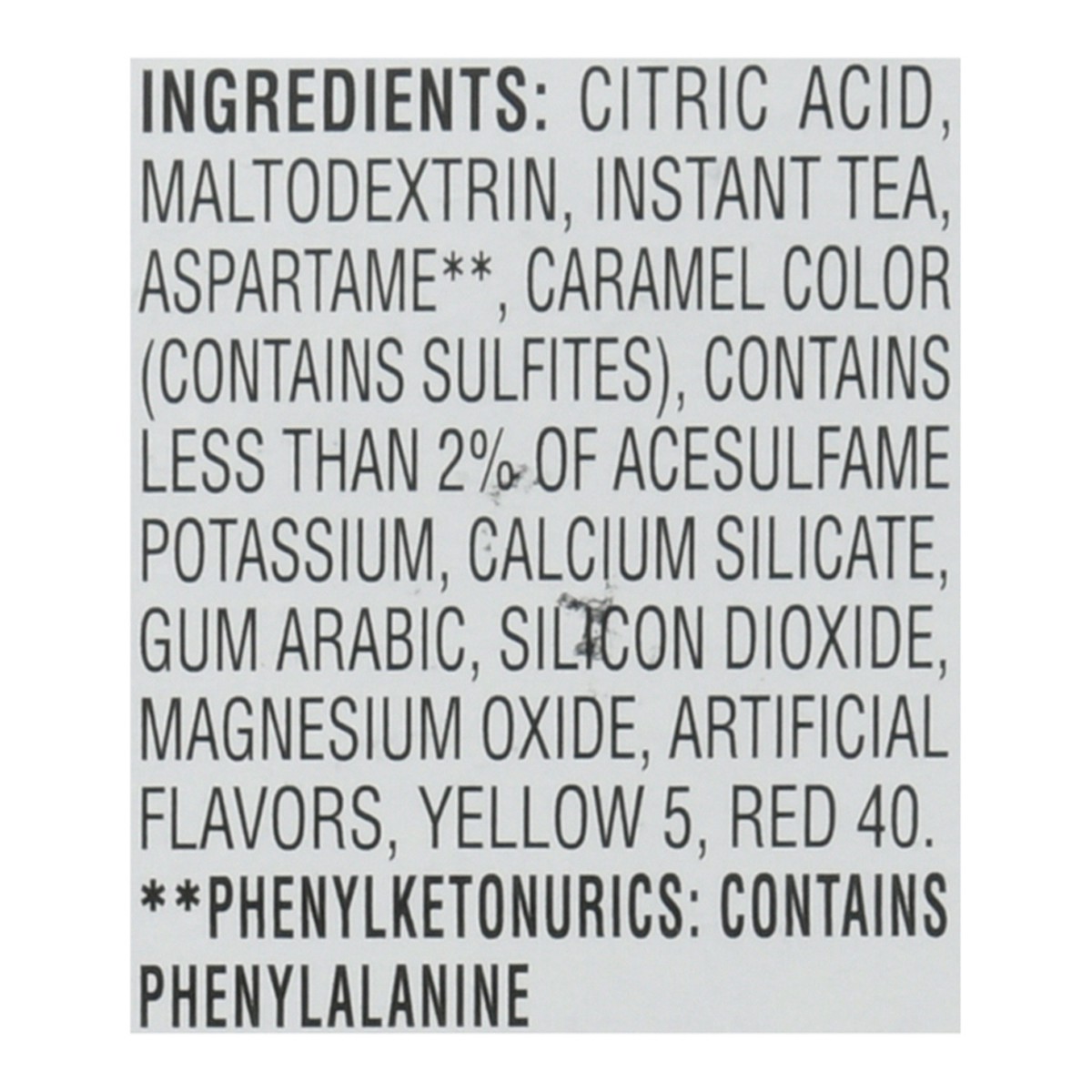 Citric Acid, Maltodextrin, Instant Tea, Aspartame (Phenylketonurics: Contains Phenylalanine), Caramel Color (Contains Sulfites), Contains Less than 2% of Acesulfame Potassium, Calcium Silicate, Gum Ar…