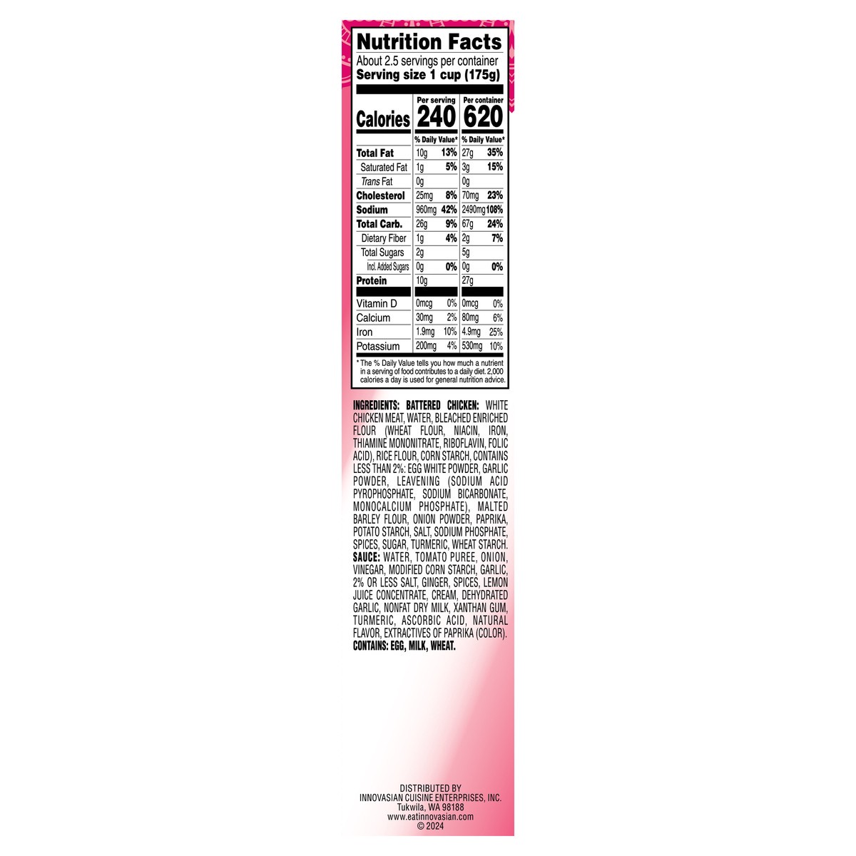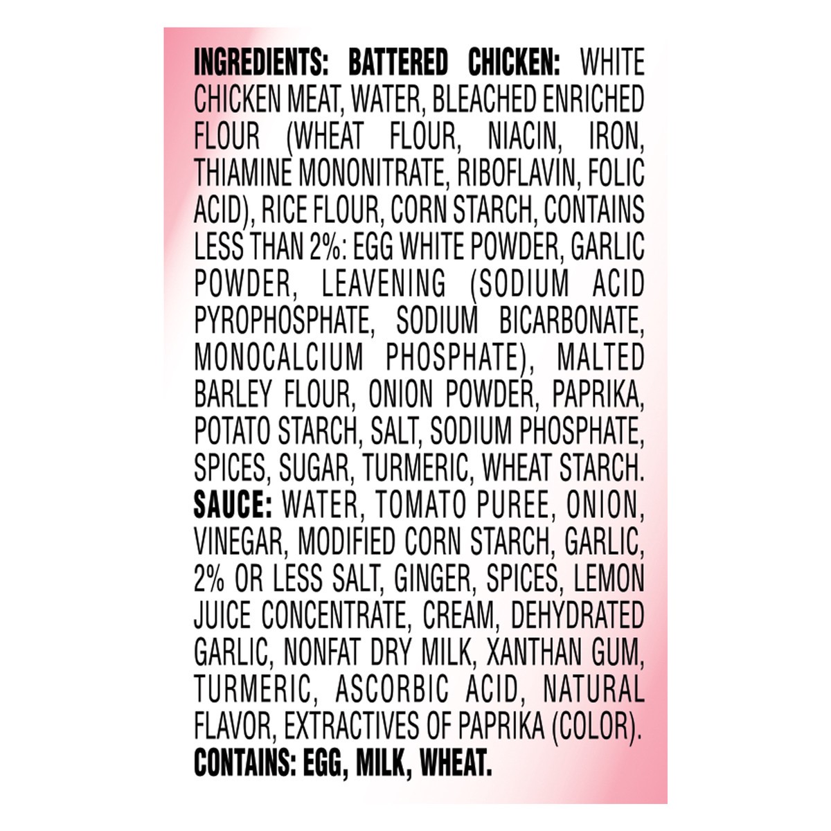 BATTERED CHICKEN: WHITE CHICKEN MEAT, WATER, BLEACHED ENRICHED FLOUR (WHEAT FLOUR, NIACIN, IRON, THIAMINE MONONITRATE, RIBOFLAVIN, FOLIC ACID), RICE FLOUR, CORN STARCH, CONTAINS LESS THAN 2%: EGG WHIT…