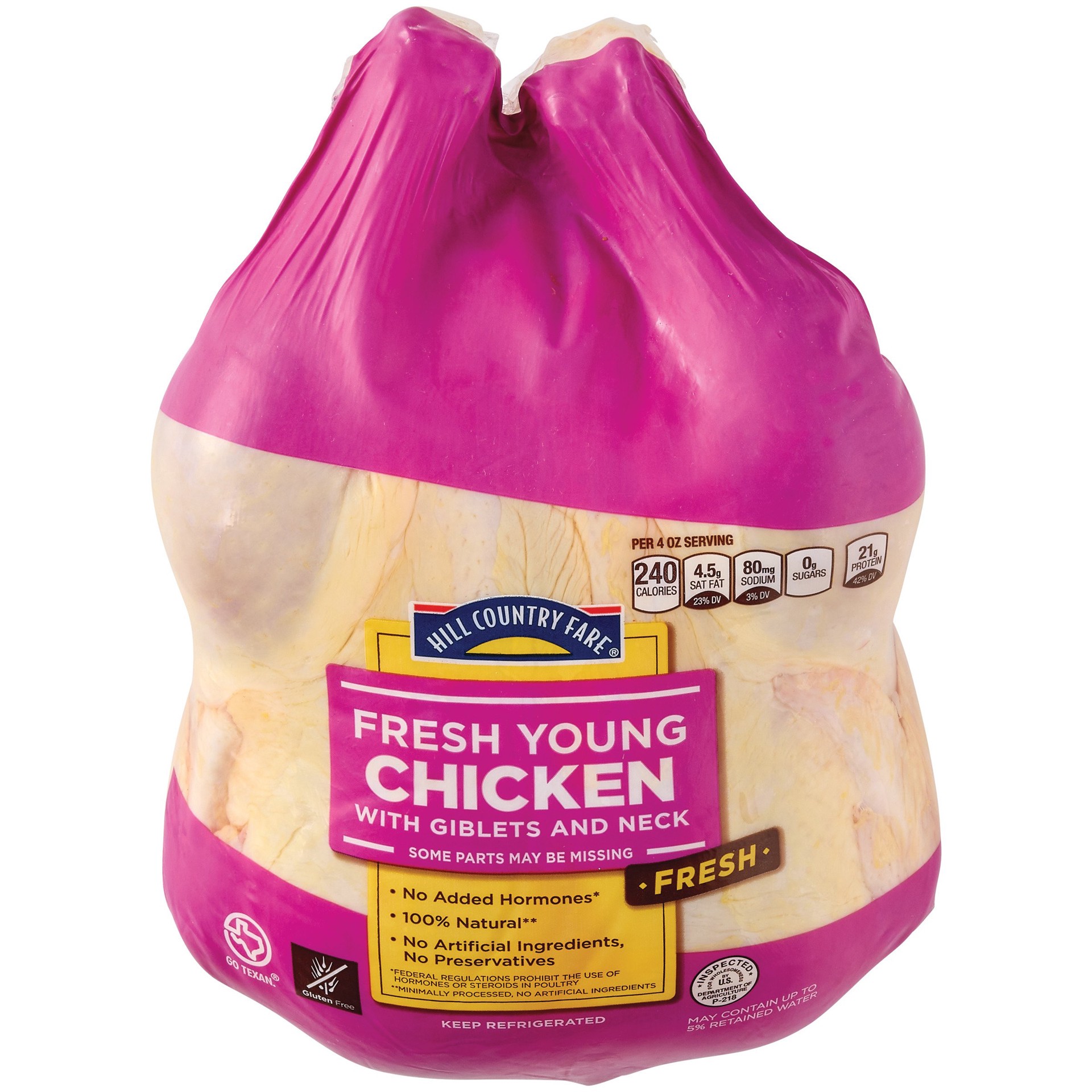 Hill Country Fare fresh young chicken is 100% natural with no added preservatives, artificial ingredients, or hormones.