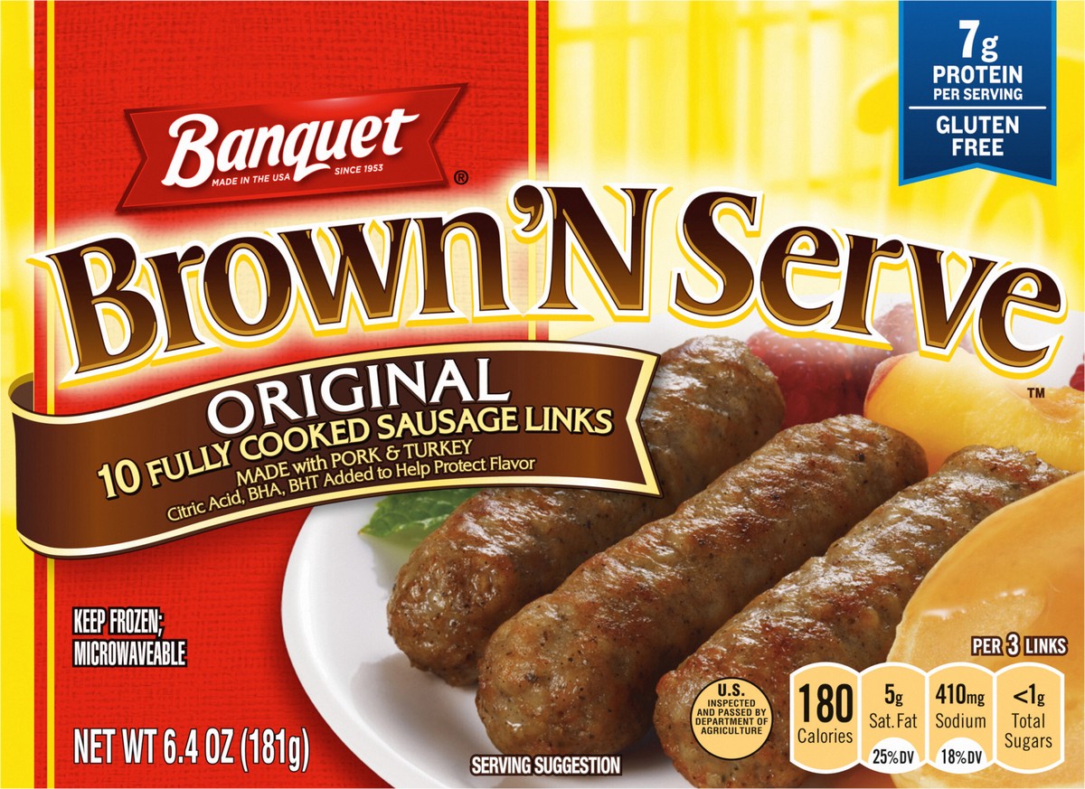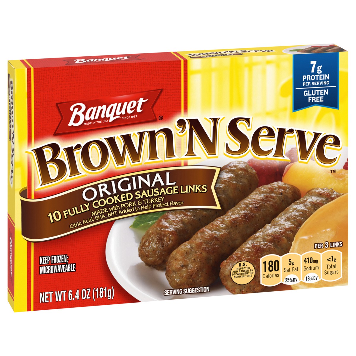 Banquet Brown ‘N Serve Original Fully Cooked Sausage Links Frozen Meat is made with pork, turkey, and a special blend of spices and seasonings. Banquet Brown ‘N Serve Vermont Maple Sausage Links are g…
