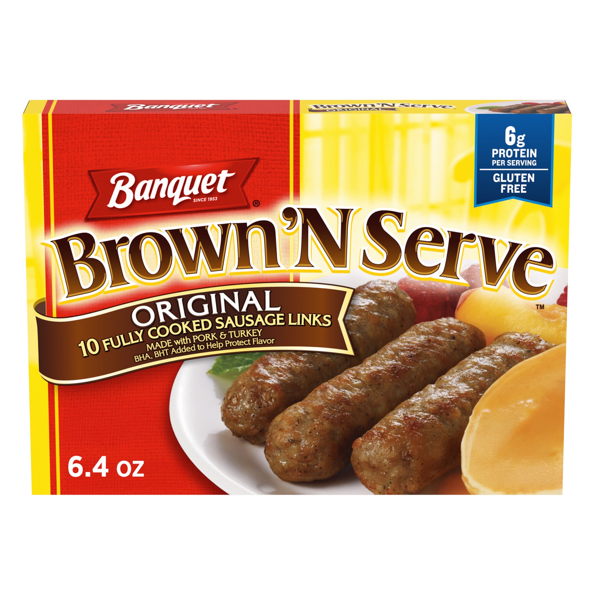 Banquet Brown ‘N Serve Original Fully Cooked Sausage Links Frozen Meat is made with pork, turkey, and a special blend of spices and seasonings. Banquet Brown ‘N Serve Vermont Maple Sausage Links are g…