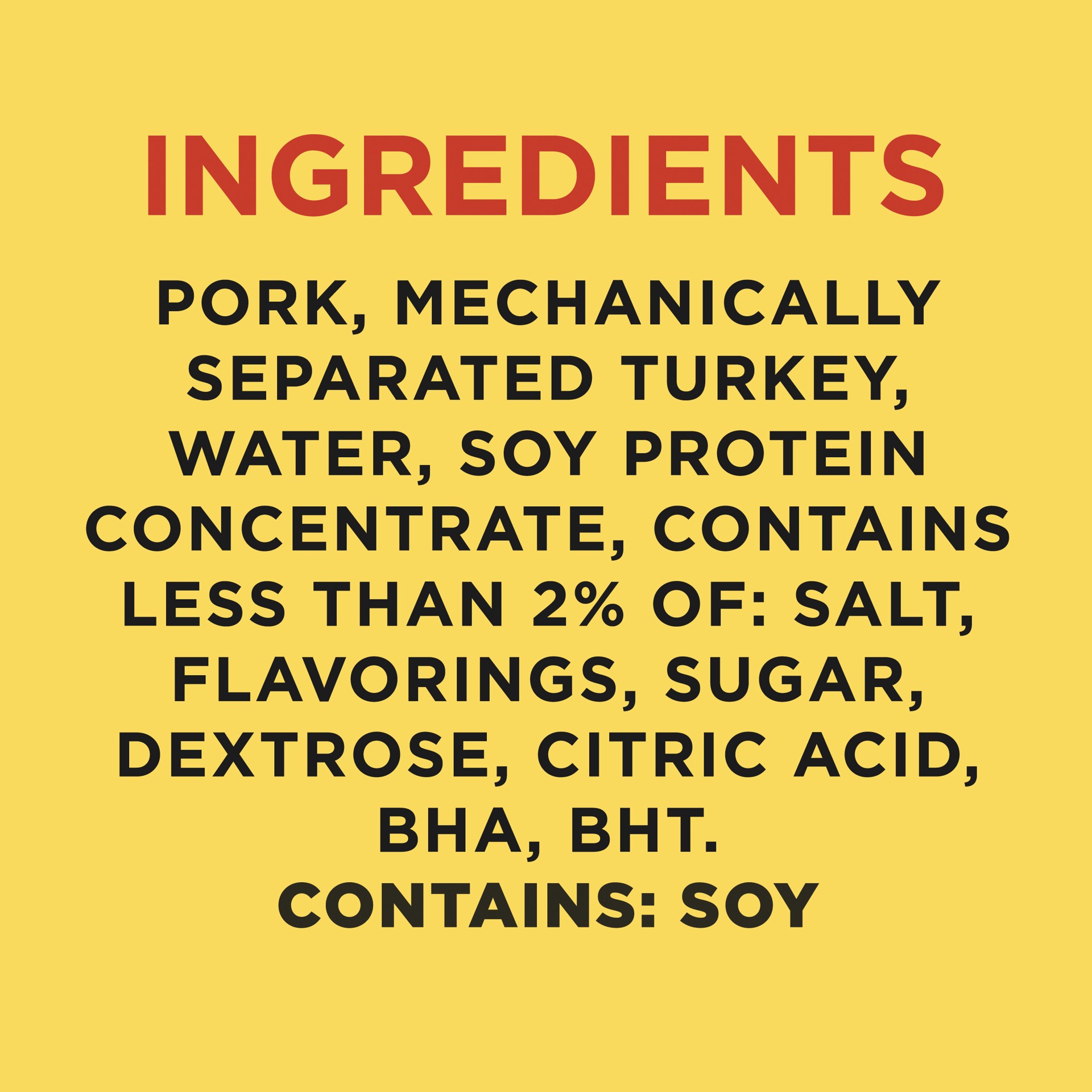 PORK, MECHANICALLY SEPARATED TURKEY, WATER, SOY PROTEIN CONCENTRATE, CONTAINS LESS THAN 2% OF: SALT, FLAVORINGS, SUGAR, DEXTROSE, CITRIC ACID, BHA, BHT. CONTAINS: SOY