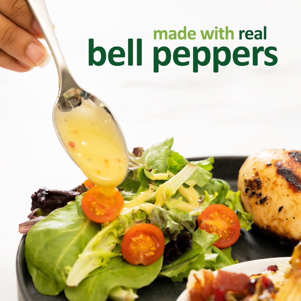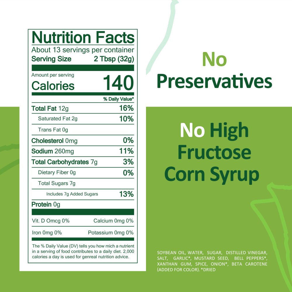 Soybean Oil, Water, Sugar, Distilled Vinegar, Salt, Garlic*, Mustard Seed, Bell Peppers*, Xanthan Gum, Spice, Onion*, Beta Carotene (Added for Color), * Dried.