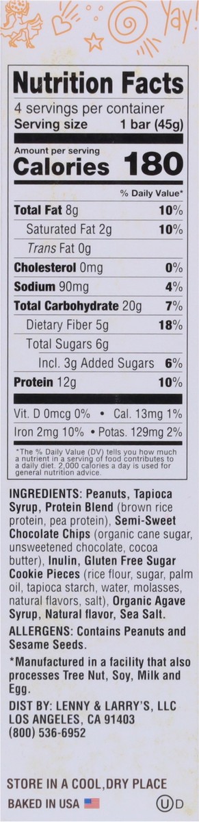Peanuts, Tapioca Syrup, Protein Blend (Brown Rice Protein, Pea Protein), Semi-Sweet Chocolate Chips (Organic Cane Sugar, Unsweetened Chocolate, Cocoa Butter), Inulin, Gluten Free Sugar Cookie Pieces (…