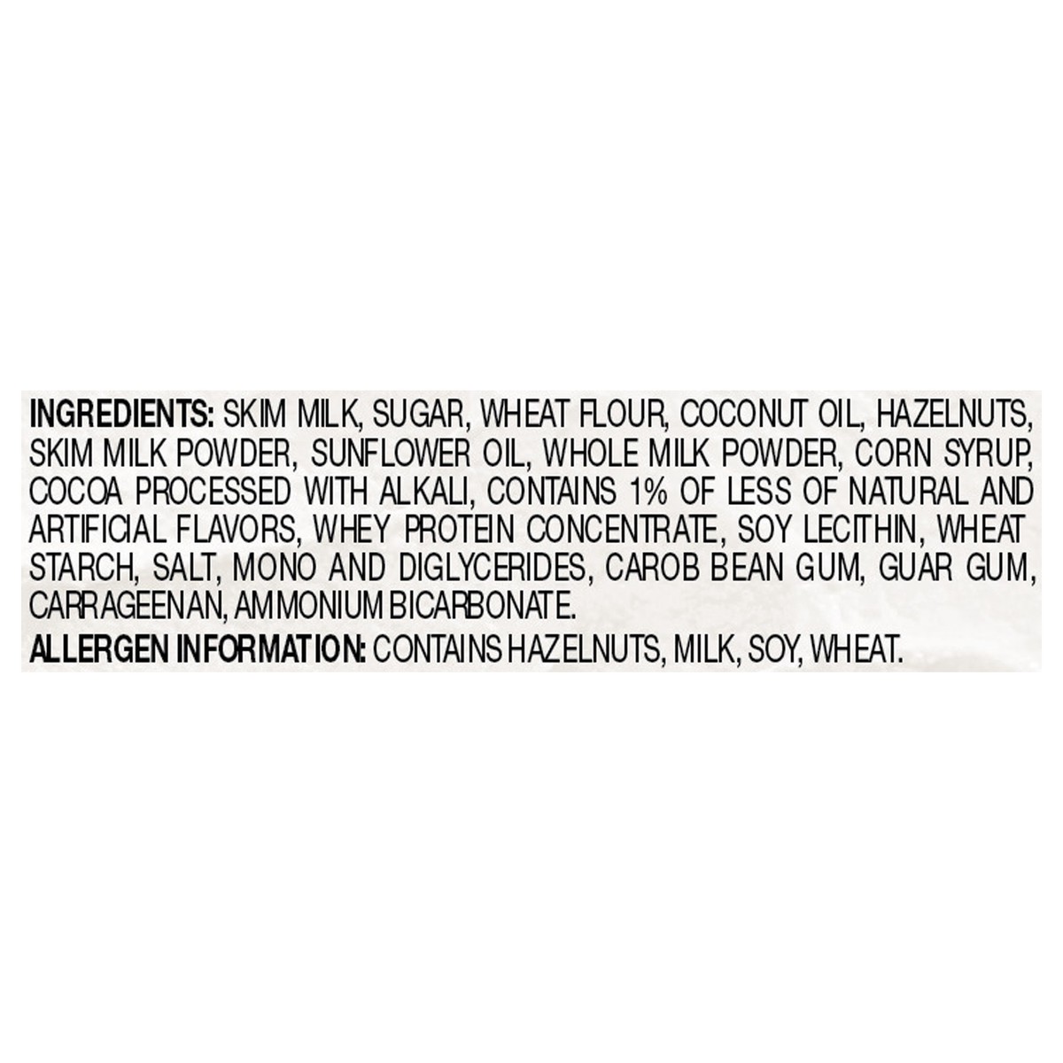 Skim Milk, Sugar, Wheat Flour, Coconut Oil, Hazelnuts, Skim Milk Powder, Sunflower Oil, Whole Milk Powder, Corn Syrup, Cocoa Processed with Alkali, Contains 1% of Less of Natural and Artificial Flavor…