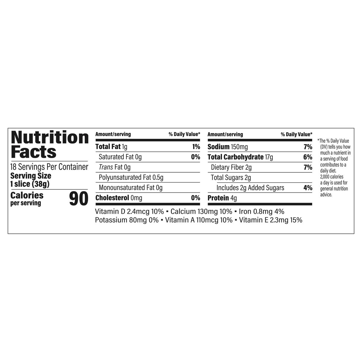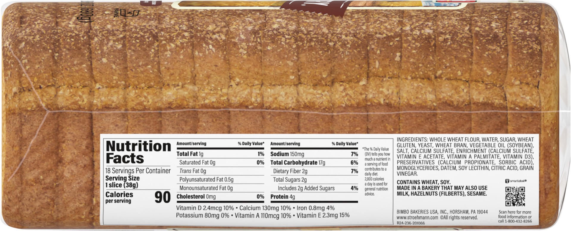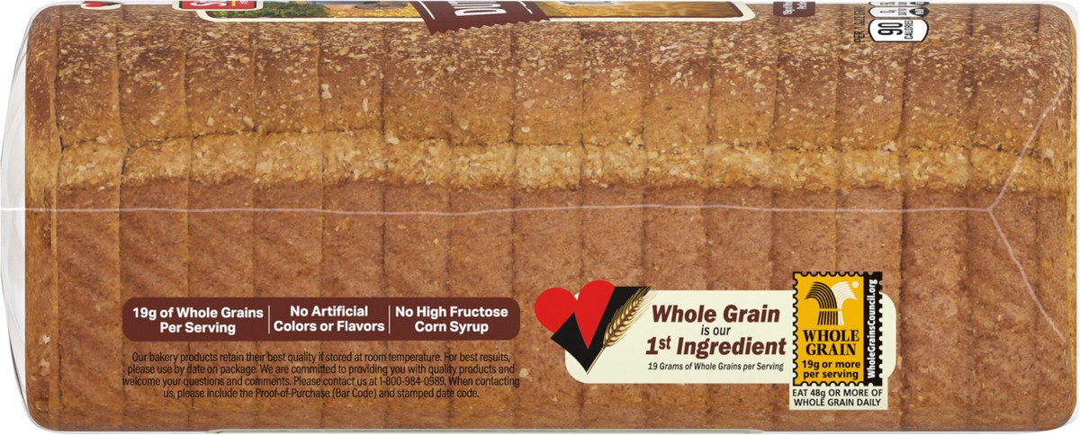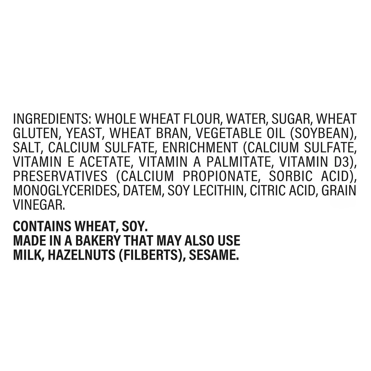 Whole Wheat Flour, Water, Sugar, Wheat Gluten, Yeast, Wheat Bran, Vegetable Oil (Soybean), Salt, Calcium Sulfate, Enrichment (Calcium Sulfate, Vitamin E Acetate, Vitamin A Palmitate, Vitamin D3), Pres…