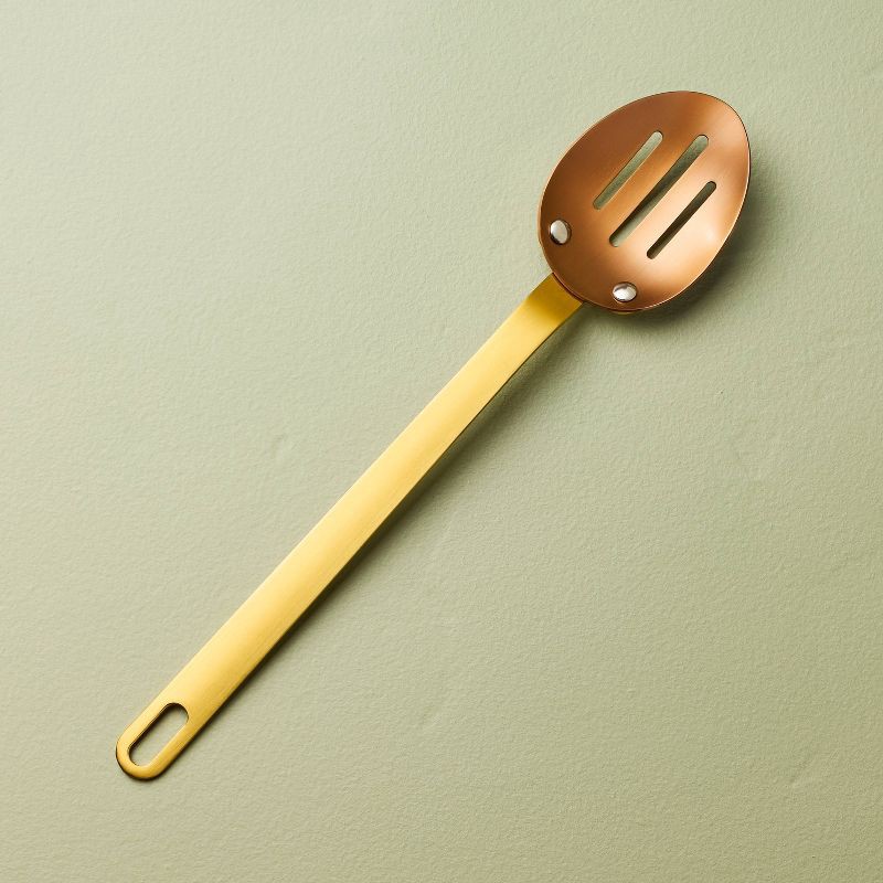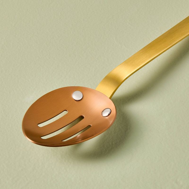 Enhance your kitchen with sophisticated style using this Copper Slotted Spoon with PVD Gold Handle from Hearth & Hand™ with Magnolia. Crafted from stainless steel, this stylish utensil features a beau…