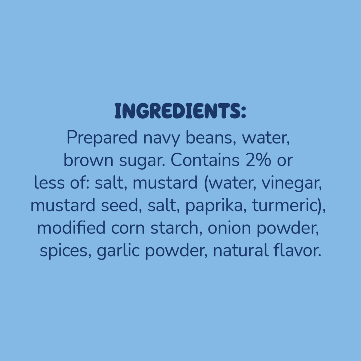Prepared Navy Beans, Water, Brown Sugar. Contains 2% or Less of: Salt, Mustard (Water, Vinegar, Mustard Seed, Salt, Paprika, Turmeric), Modified Corn Starch, Onion Powder, Spices, Garlic Powder, Natur…