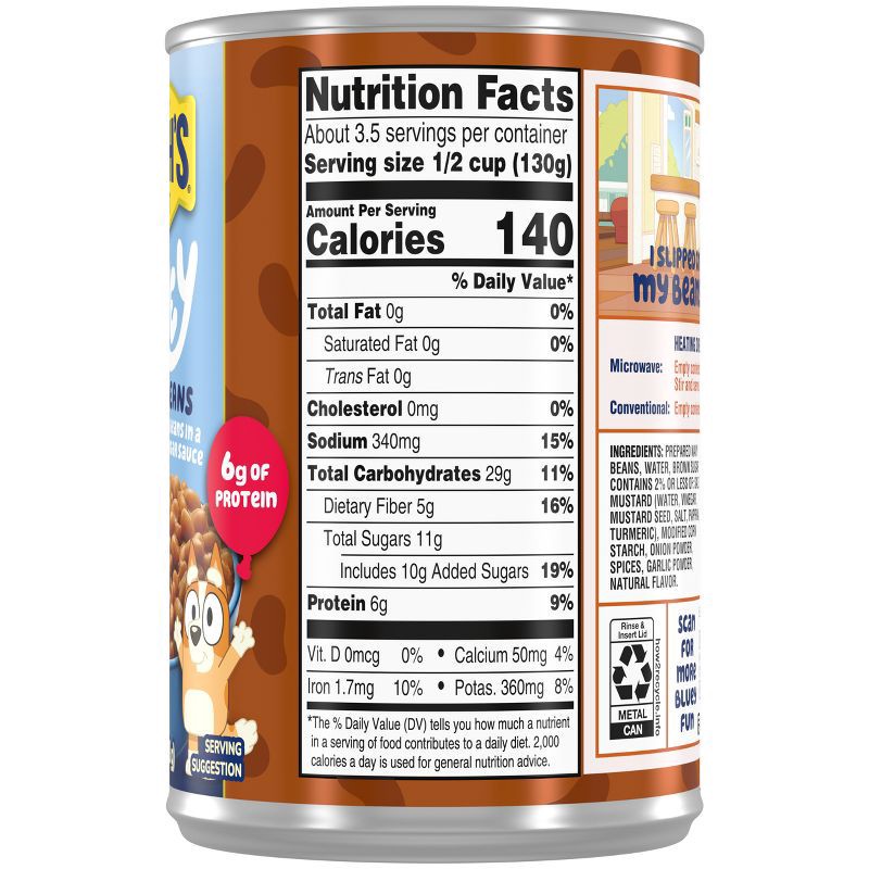 - Stock your pantry with 15.8oz recyclable cans of Bush's Bluey Baked Beans.