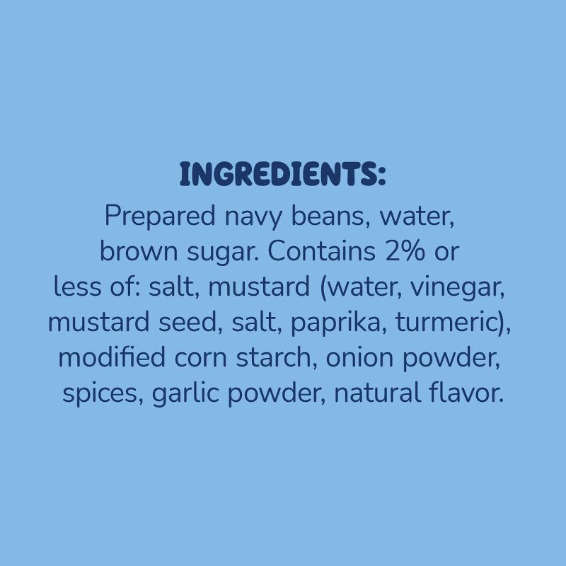 PREPARED NAVY BEANS, WATER, BROWN SUGAR. CONTAINS 2% OR LESS OF: SALT MUSTARD (WATER, VINEGAR, MUSTARD SEED, SALT, PAPRIKA, TURMERIC), MODIFIED CORN STARCH, ONION POWDER, SPICES, GARLIC POWDER, NATURA…