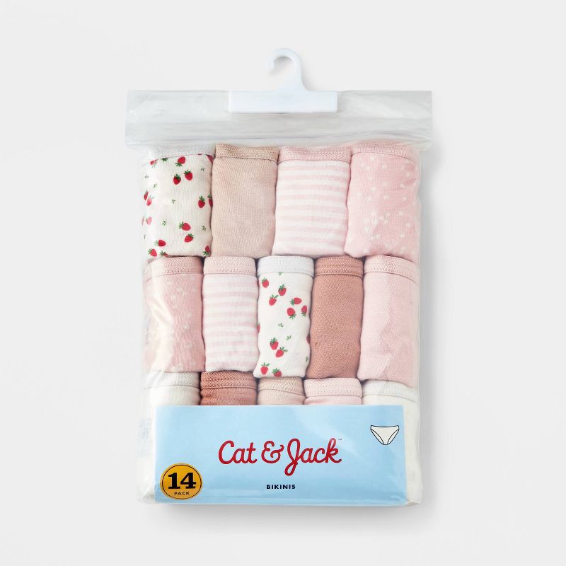 Upgrade their everyday essentials with these 14-Pack Strawberry Bikini Underwear from Cat & Jack™. The pack includes 14 pairs of mid-rise bikini underwear in assorted colors and prints, giving you a r…