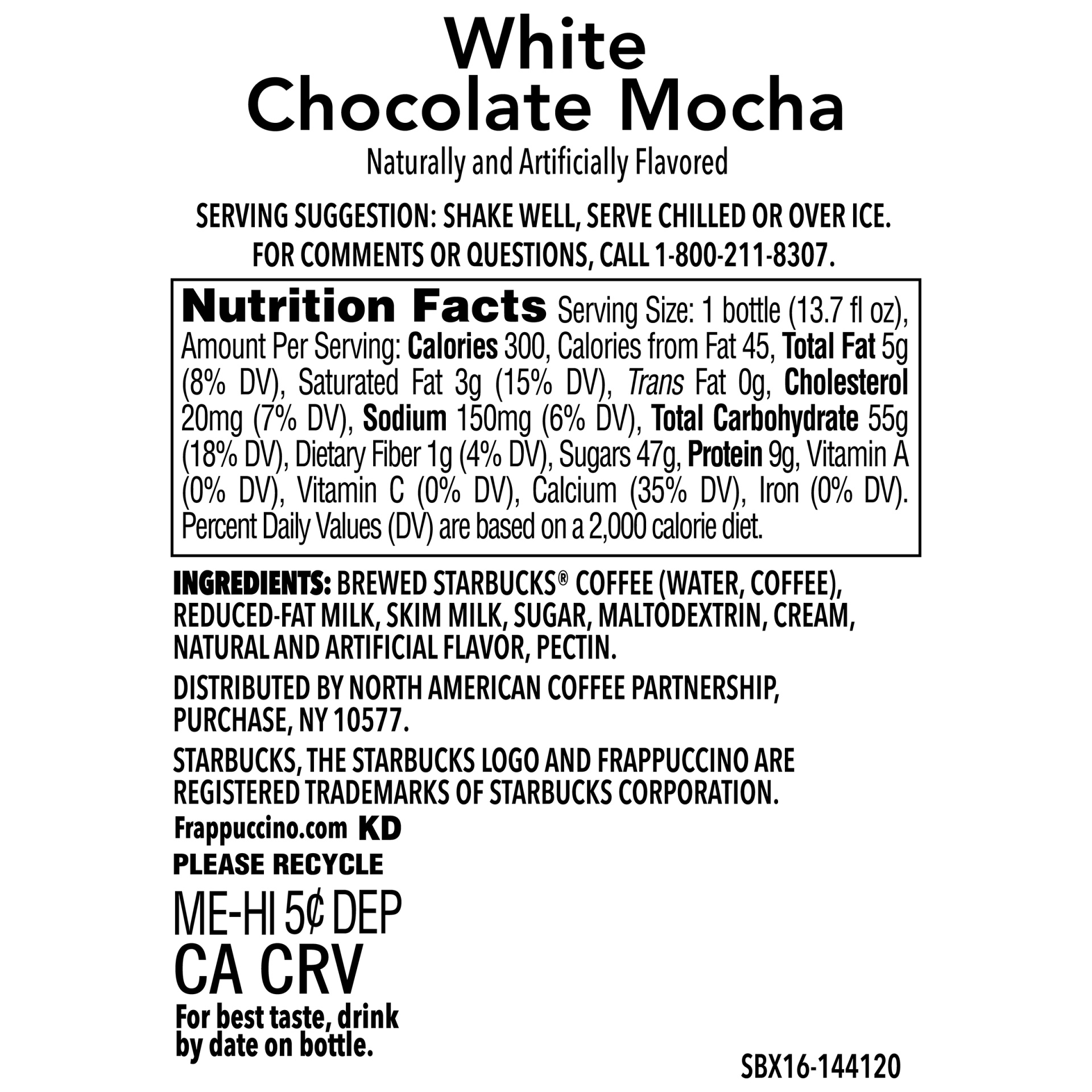 Pop the cap. Savor the sip. Go. White Chocolate Mocha Frappuccino chilled coffee drink is a harmonious blend of Starbucks coffee and creamy milk infused with the sweet flavor of white chocolate.