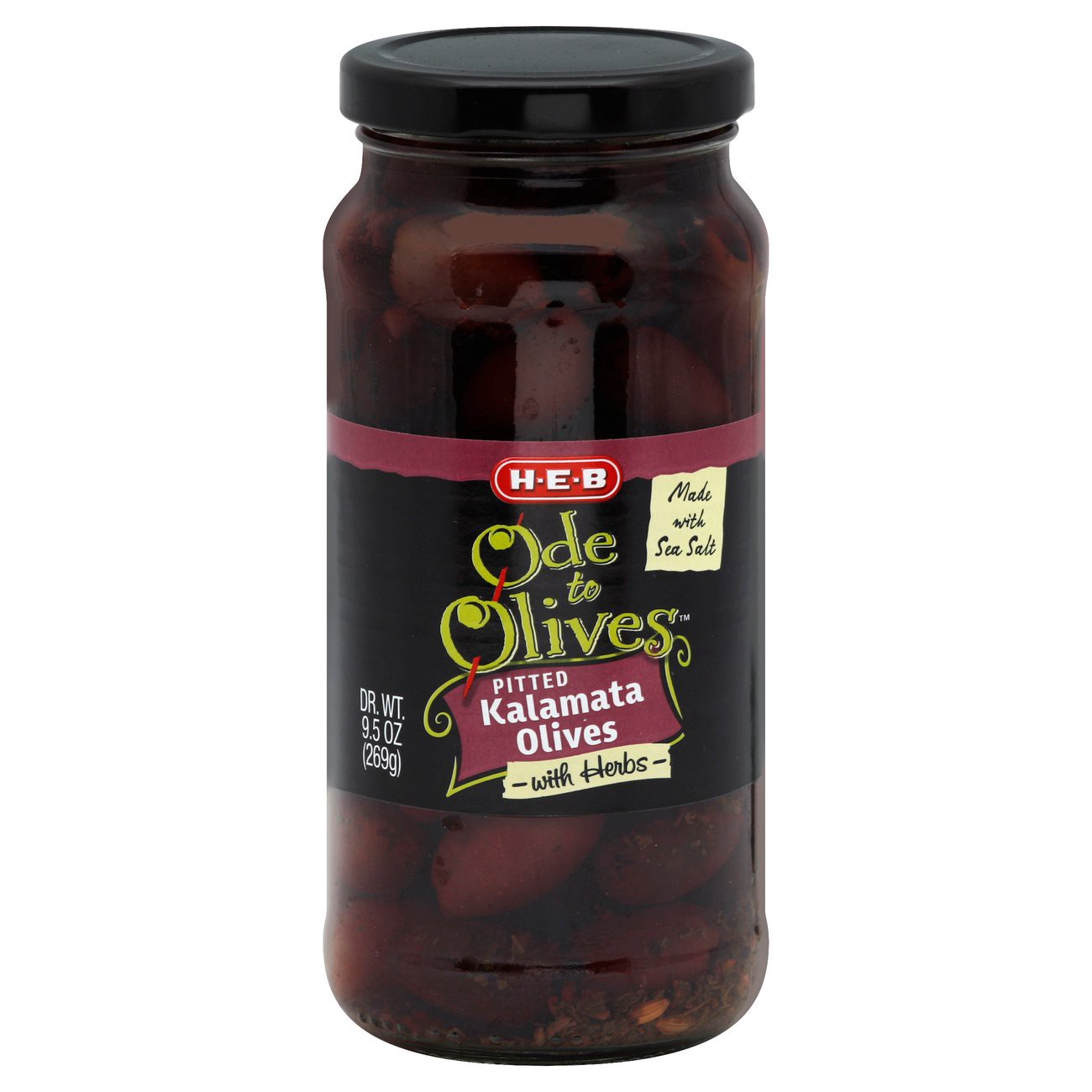 H-E-B Ode to Olives pitted Kalamata olives are brined in sea salt and herbs for that classic taste. Add some to a Greek salad, charcuterie board or snack on them on their own.• Pitted Kalamata olives•…