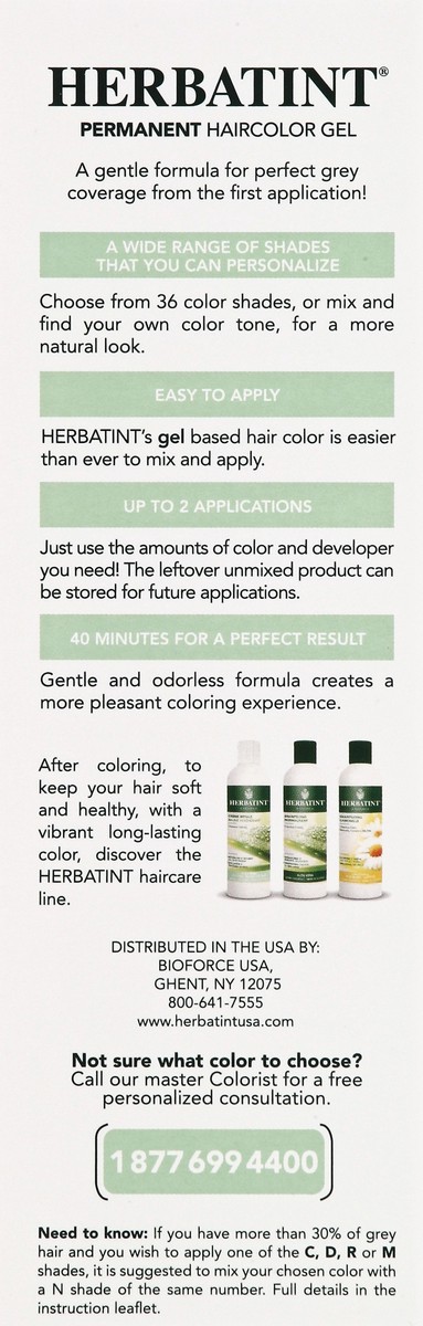 Herbatint Haircolor Gel: Laureth-4, Propylene Glycol, Aqua (Water), PEG-2 Oleamine, Ethanolamine, Oleic Acid, Aloe Barbadensis (Aloe Vera) Leaf Extract, Hamamelis Virginiana (Witch Hazel) Leaf Extract…