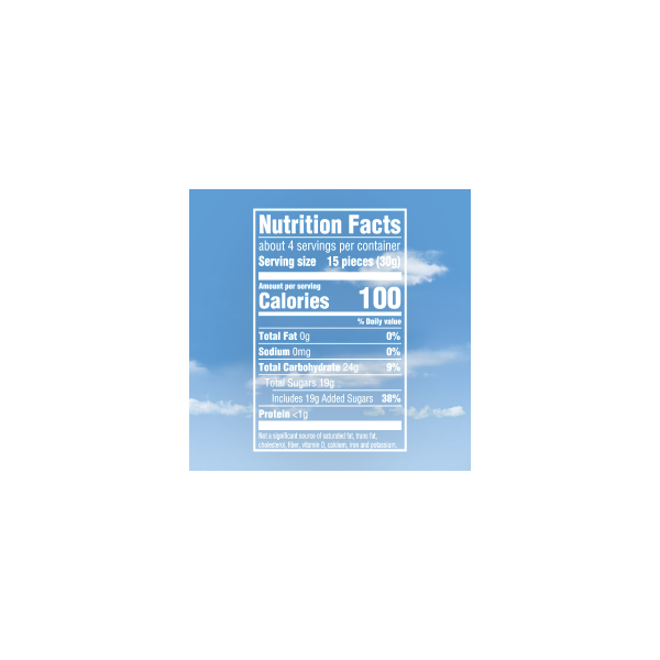 Corn Syrup, Sugar, Modified Corn Starch, Water, Gelatin; Less than 2% of: Citric Acid, Malic Acid, Natural and Artificial Flavors, Sunflower Oil, Colors (Red 40, Yellow 5, Blue 1), Carnauba Wax.