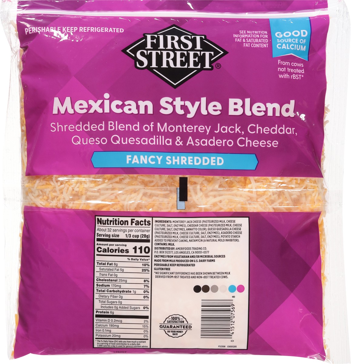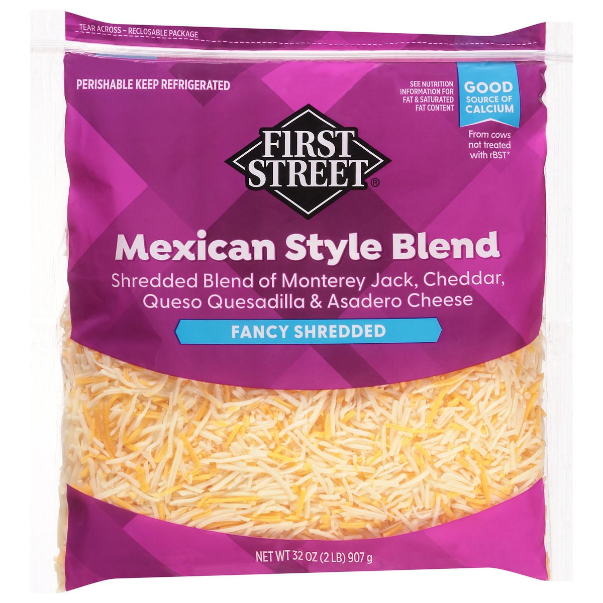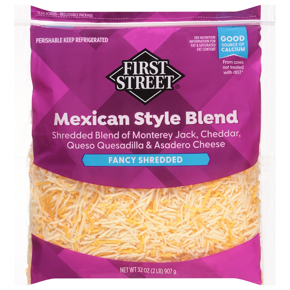 First Street Shredded Mexican Blend Cheese, Taco night essential. First Street Mexican Blend Cheese combines Cheddar, Monterey Jack, Asadero, and Queso Quesadilla. Melts smoothly for nachos and quesad…