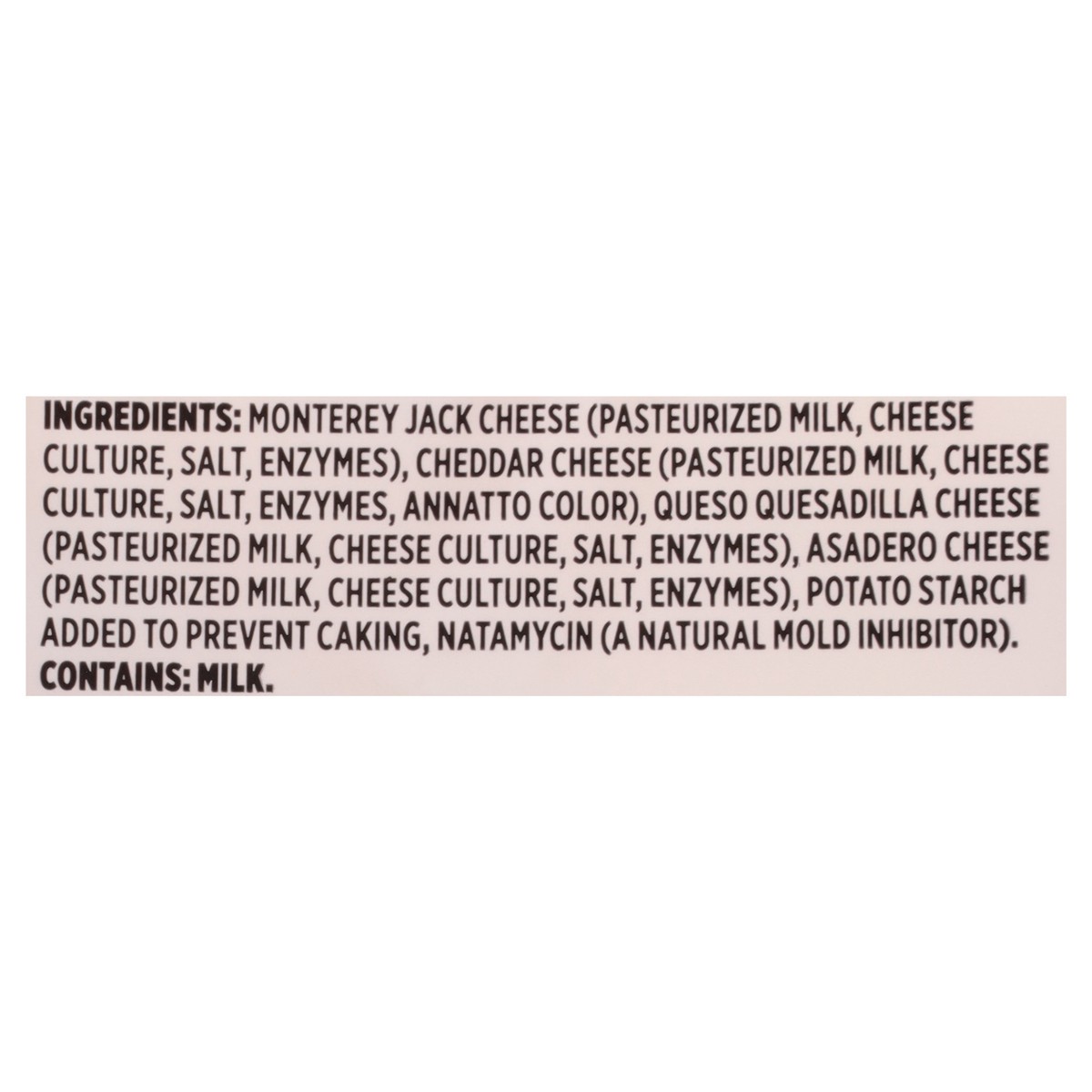 Monterey Jack Cheese (Pasteurized Milk, Cheese Culture, Salt, Enzymes), Cheddar Cheese (Pasteurized Milk, Cheese Culture, Salt, Enzymes, Annatto Color), Queso Quesadilla Cheese (Pasteurized Milk, Chee…