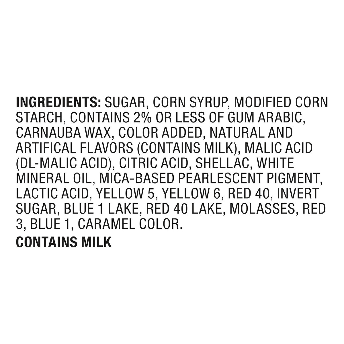 Sugar, Corn Syrup, Modified Corn Starch, Contains 2% or Less of Gum Arabic, Carnauba Wax, Color Added, Natural and Artificial Flavors (Contains Milk), Malic Acid (DL-Malic Acid), Citric Acid, Shellac,…