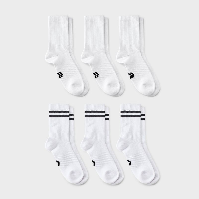 Boys' 6pk Varsity Striped Arch Support Cushioned Crew Socks - All In Motion™ Bright White M