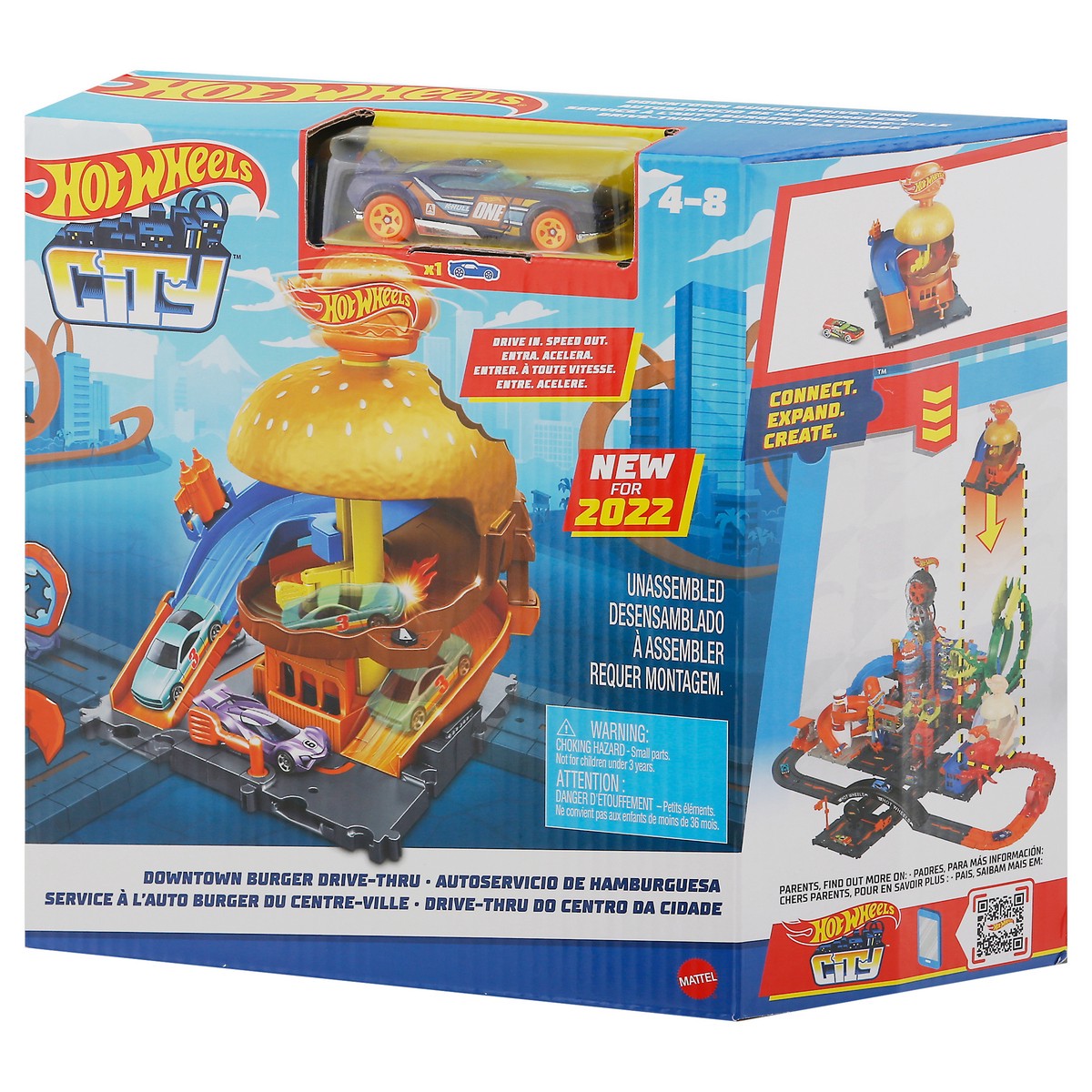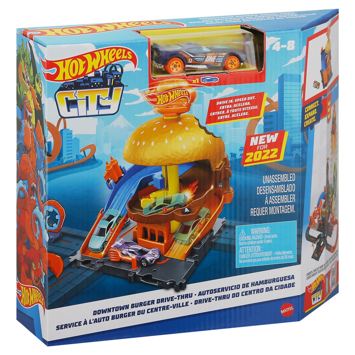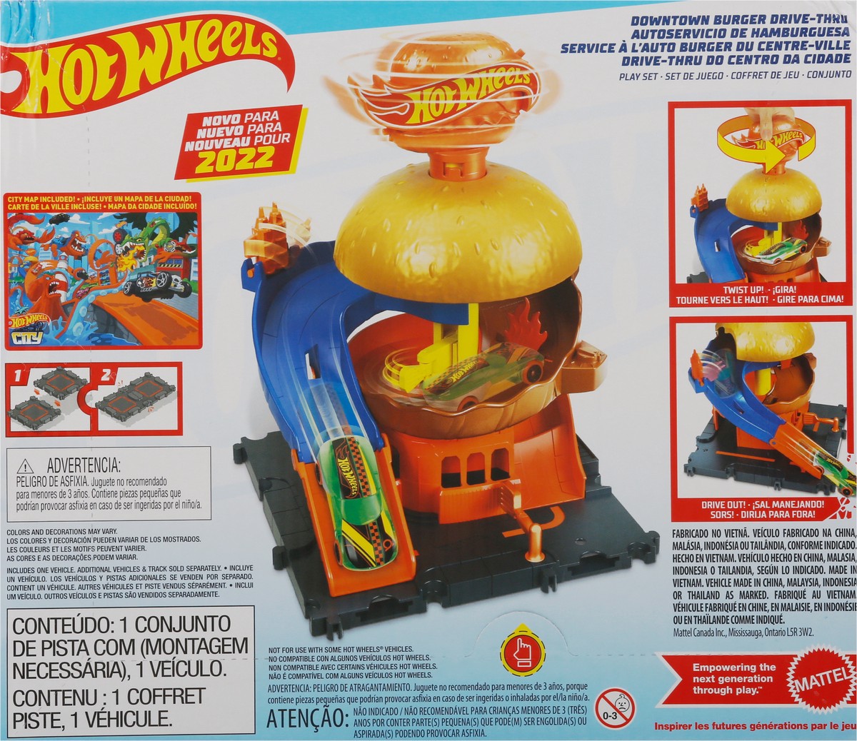 Drive in. Speed out. New for 2022. Connect. Expand. Create. City map included. Twist up! Drive out! Includes one vehicle. Empowering the next generation through play.