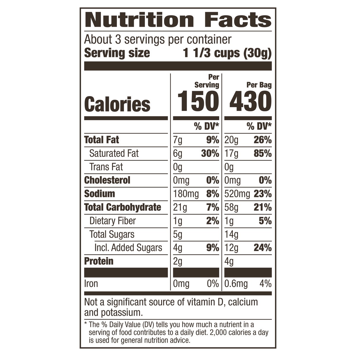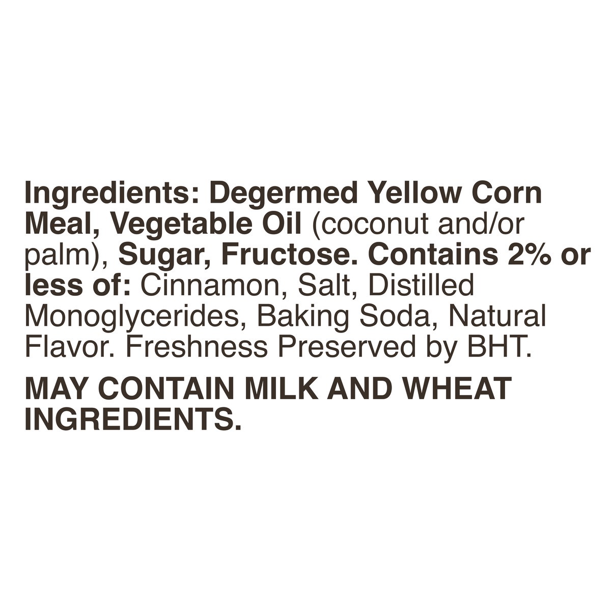 Degermed Yellow Corn Meal, Vegetable Oil (Coconut and/or Palm), Sugar, Fructose, Contains 2% or Less of: Cinnamon, Salt, Distilled Monoglycerides, Baking Soda, Natural Flavor, Freshness Preserved by B…